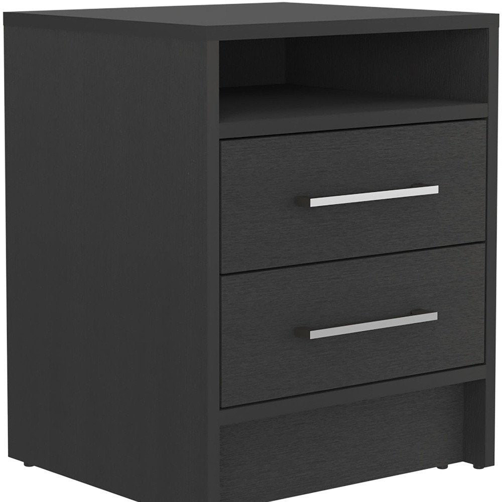 Good looking design and practical styling meet to form this 20-inch black two drawer faux wood nightstand. Sturdy and durable construction from manufactured wood ensures this trusty bedside table is built to last. The piece has 2 drawers to store your bedtime essentials close to you as you rest. An easy-access shelf gives you additional storage and display space. The unsung hero of the bedroom, this nightstand is perfect for keeping a glass of water, lamp, alarm clock, jewelry, and more, close by and easily accessible. Versatile in use this nightstand would also work as a great end table in the living room, hallway, or office. 19.9-inch H x 15.7-inch W x 14.7-inch D