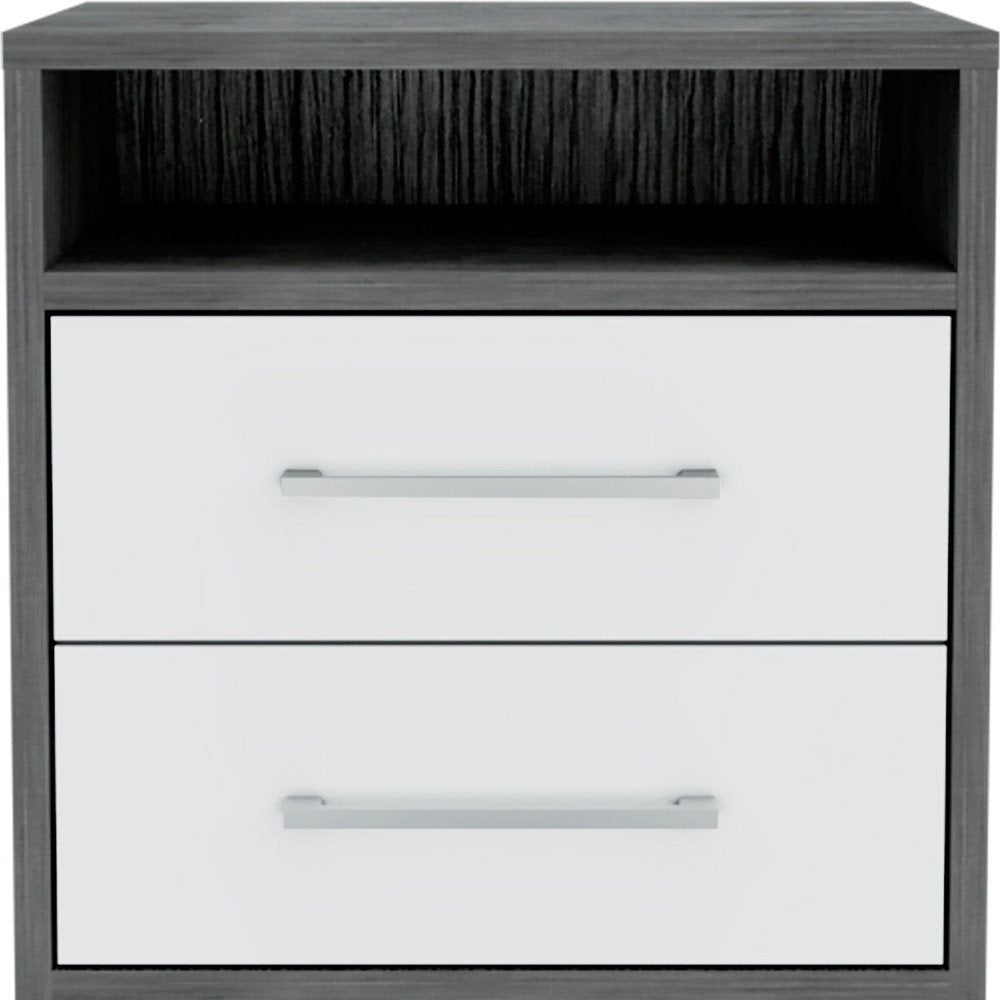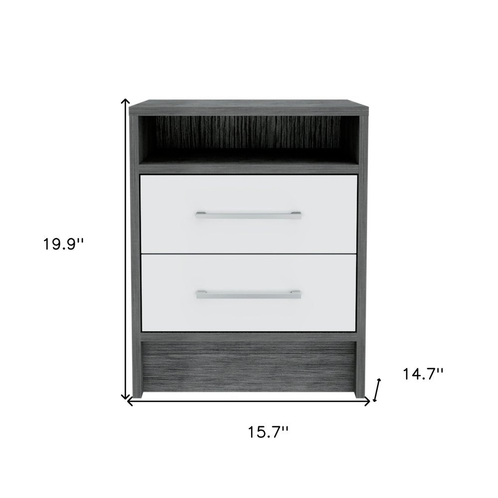Our 20-inch gray wood two drawer nightstand will compliment your bed beautifully. Made of high quality manufactured wood that is built to last. The piece has 2 drawers to store your bedtime essentials close to you as you rest. An easy-access shelf gives you additional storage and display space. The unsung hero of the bedroom, this nightstand is perfect for keeping a glass of water, lamp, alarm clock, jewelry, and more, close by and easily accessible. Versatile in use this nightstand would also work as a great end table in the living room, hallway, or office. 19.9-inch h x 15.7-inch w x 14.7-inch d.