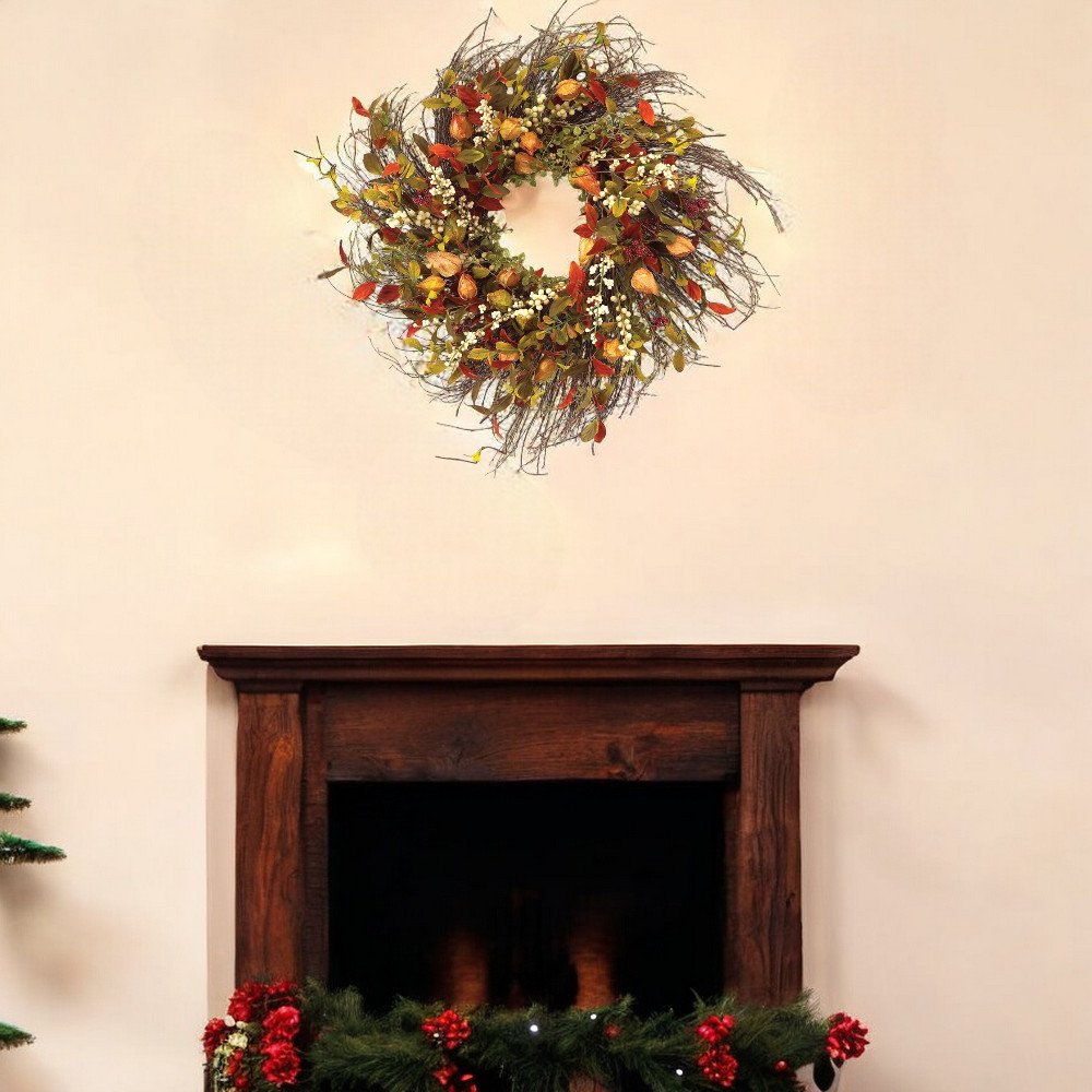 Made to mimic the real thing, this artificial wreath stays green year after year, with no watering needed. This lovely wreath makes a wonderful gift and is sure to brighten someone's day. Featuring a classic circular shape, this traditional wreath is designed for covered outdoor use, making it perfect for enhancing your entryway or patio. Constructed from durable polyester, it showcases a beautiful blend of brown, green, and white hues that pairs seamlessly with various decor styles. This mixed assortment provides an inviting touch to your seasonal decorations. 20-inch h x 20-inch w x 5-inch d.