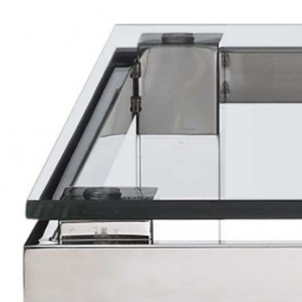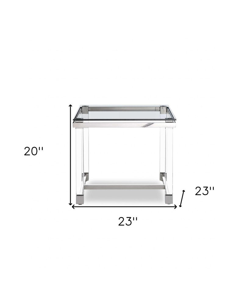 Distinctive in style the 20" silver and clear glass end table radiates a versatile charm. The base of this table is made from stainless steel in a silver color that is a nice contrast to the clear glass tabletop. An ideal location for placing your snacks and drinks, and a place to keep your lamp, frames, or other accessories. You can match it with other pieces to get the ideal look for your place. 20" H x 23" W x 23" D