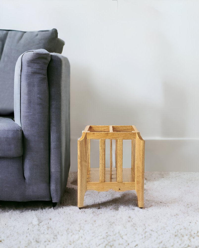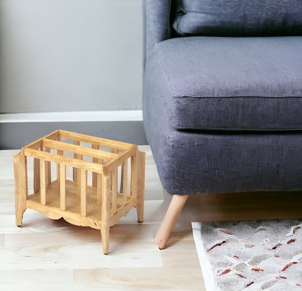 Crafted from wood solids and oak veneers, the Natural woo magazine basket is a beautiful combination of color, form and function. The easily accessible design permits for trouble-free storage. Slatted panels and scalloped edge form the framework of this chocolate brown basket. A middle divider panel enhances the storage capacity of the basket while an open framework enables you to shift it from room to room. 17-inch H x 21-inch W x 15-inch D