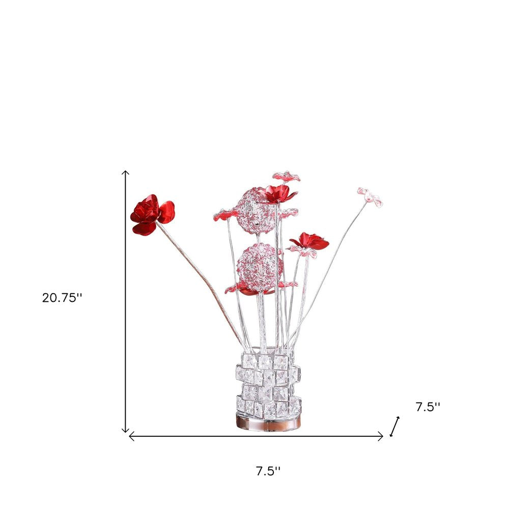 This 21-inch silver and clear metal and faux crystal geometric and roses bedside lamp is a great way to add some brightness to any corner of your home. This super unique lamp will add a floral element to your space along with soft light and romantic ambiance. Featuring a mix of silver, clear, and red, with faux crystal bling, and flowers, this mixed material lamp combines aluminum and acrylic into a geometric spaded vase. Will add a soft and cozy glow to your bedroom. Great for evening reading. 20.75-inch H x 7.5-inch W x 7.5-inch D