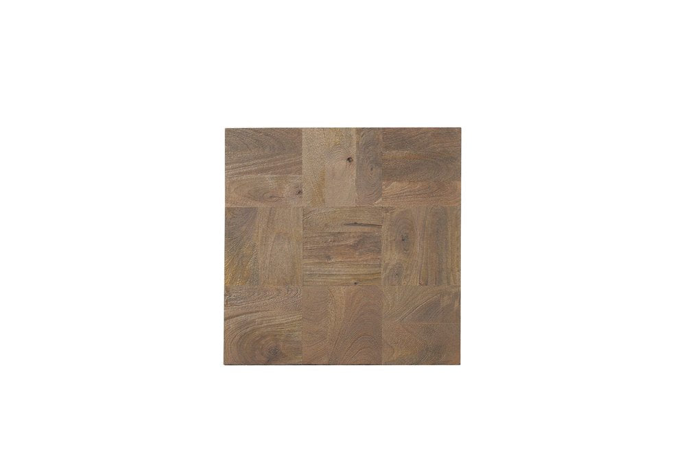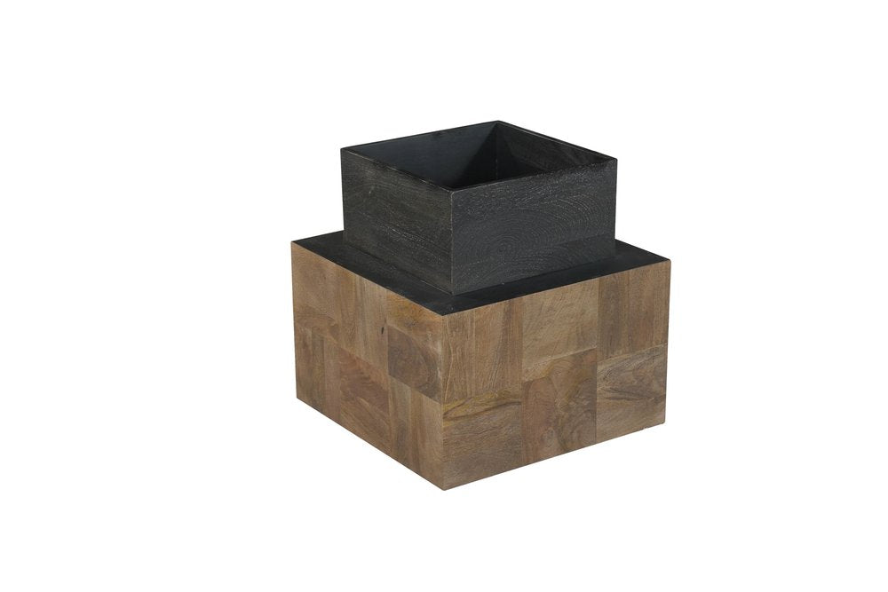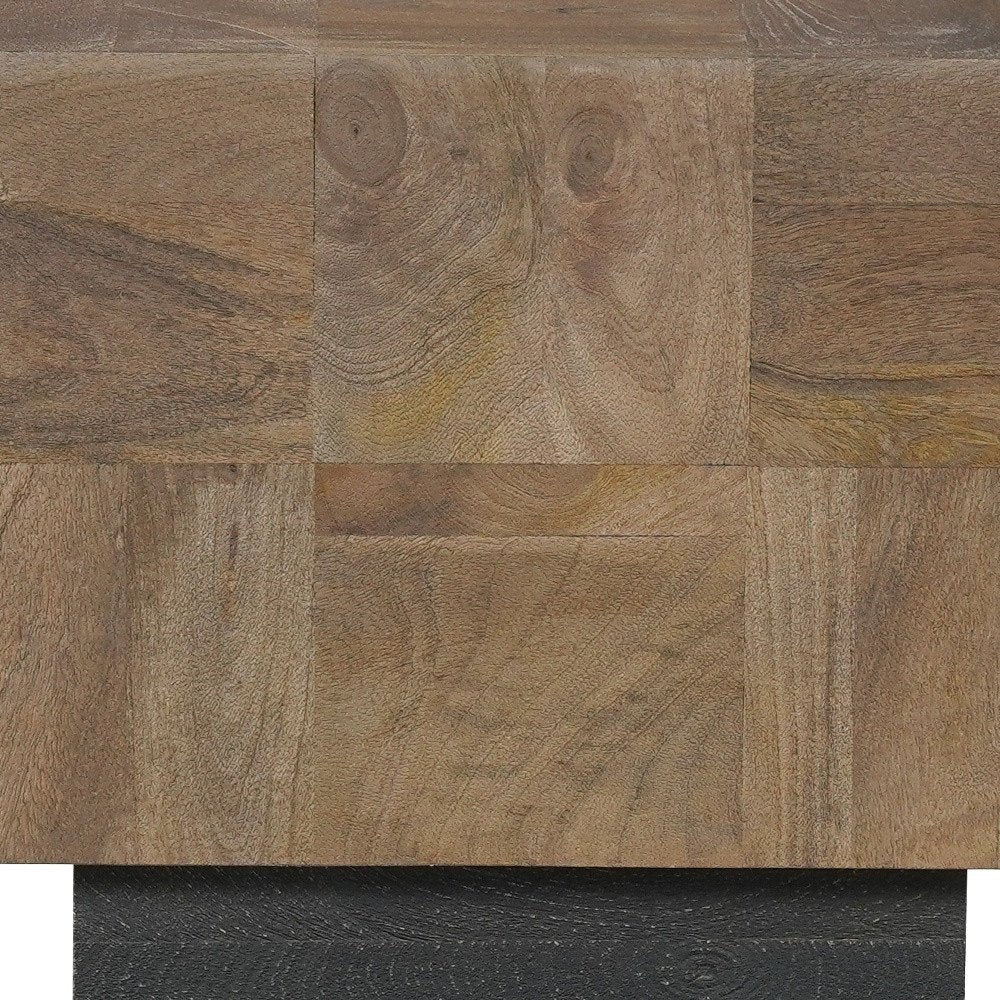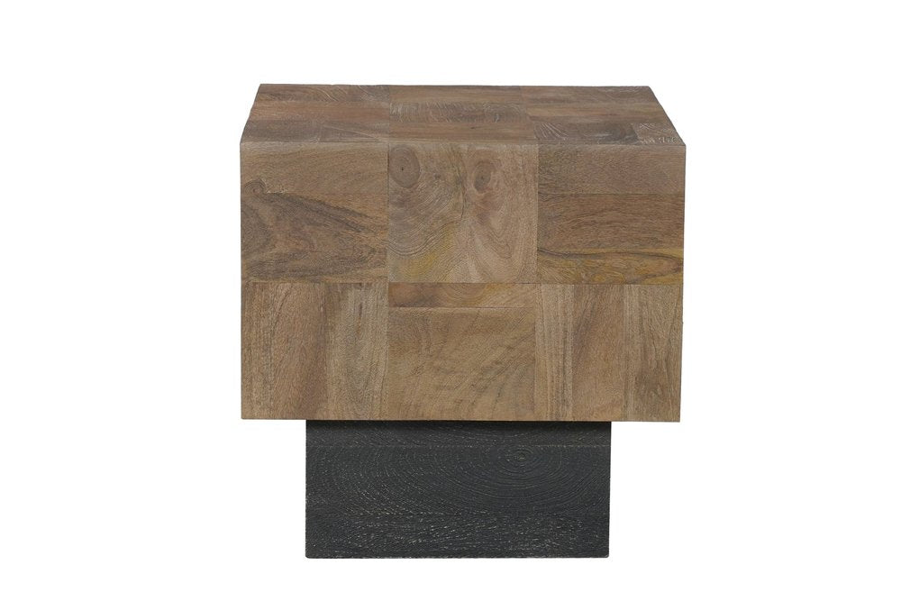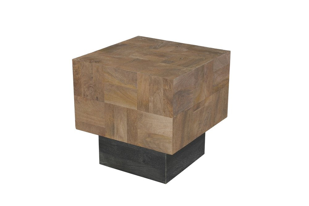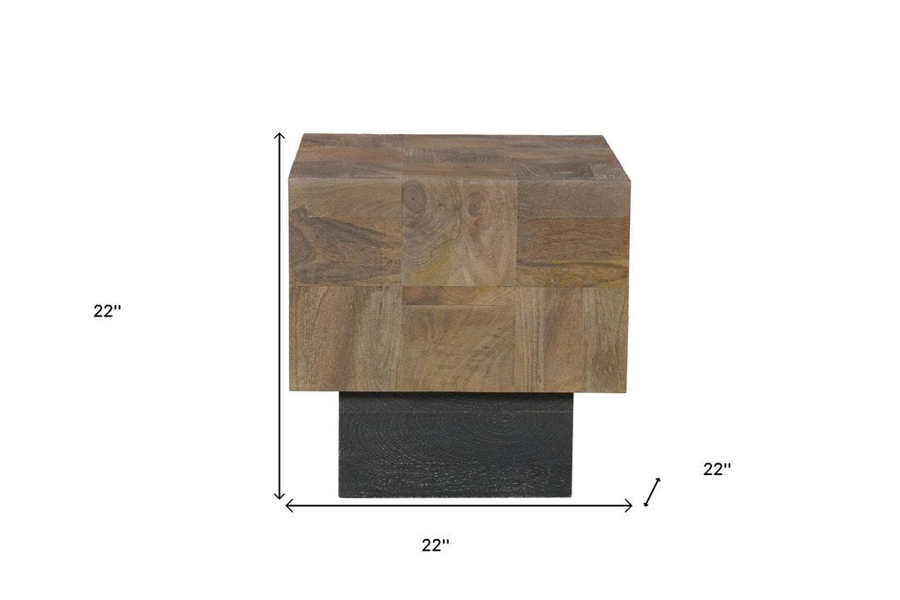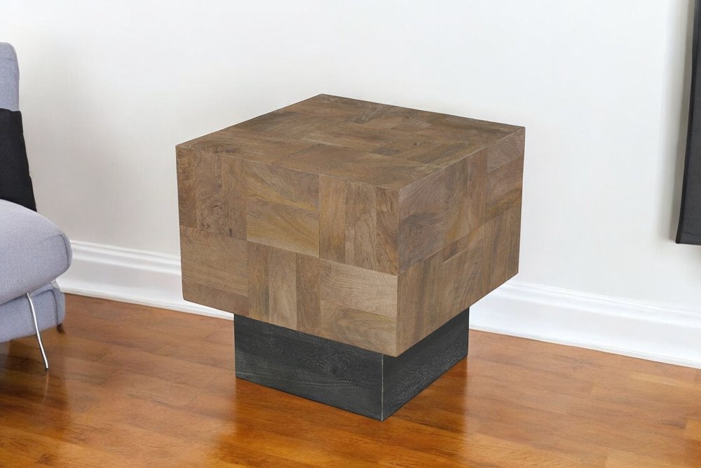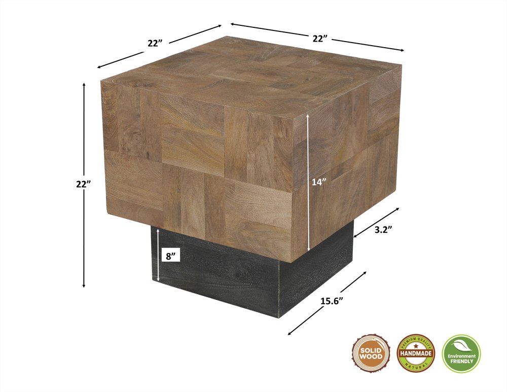 Distinctive in style the 22-inch black and brown solid wood square end table radiates a modern and contemporary vibe. The top is a solid block in shades of brown with a wood block parquet style pattern, while the base is a nice compliment in black. This minimalist design will blend nicely into multiple design aesthetics. An ideal location for placing your snacks and drinks, and a place to keep your lamp, frames, or other accessories. 22-inch H x 22-inch W x 22-inch D
