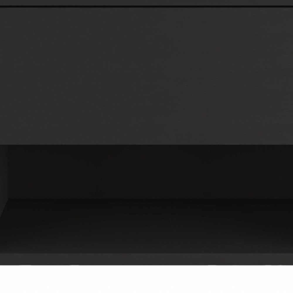 Give your room the look and feel of 5-star accommodations with this 22-inch black wood one drawer nightstand. Robust in design, the bed side table has been expertly crafted from manufactured wood. The easy open drawer allows you hidden storage to keep your essentials close at hand. An easy-access shelf gives you additional storage and display space. The unsung hero of the bedroom, this nightstand is perfect for keeping a glass of water, lamp, alarm clock, jewelry, and more, close by and easily accessible. Versatile in use this nightstand would also work as a great end table in the living room, hallway, or office. 21.88-inch h x 18.89-inch w x 15.74-inch d.