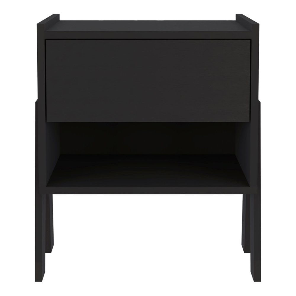 Good looking design and practical styling meet to form this 22-inch black wood one drawer nightstand. Sturdy and durable construction from manufactured wood ensures this trusty bedside table is built to last. Includes a drawer to help keep your essentials close by and hidden. An easy-access shelf gives you additional storage and display space. The unsung hero of the bedroom, this nightstand is perfect for keeping a glass of water, lamp, alarm clock, jewelry, and more, close by and easily accessible. Versatile in use this nightstand would also work as a great end table in the living room, hallway, or office. 21.8-inch h x 18.8-inch w x 15.7-inch d.