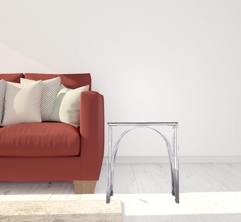 Optimize your space and add some charm to your room with the 22" chrome glass and iron square end table. This marvelous end or side table is made from high quality metal. The chrome coloration runs throughout this good-looking iron and glass table. A great accent on either side of the sofa or bed, this adorable end or side table is just what you need. You can also use it as an entryway table to hold your keys. 22" H x 19" W x 19" D