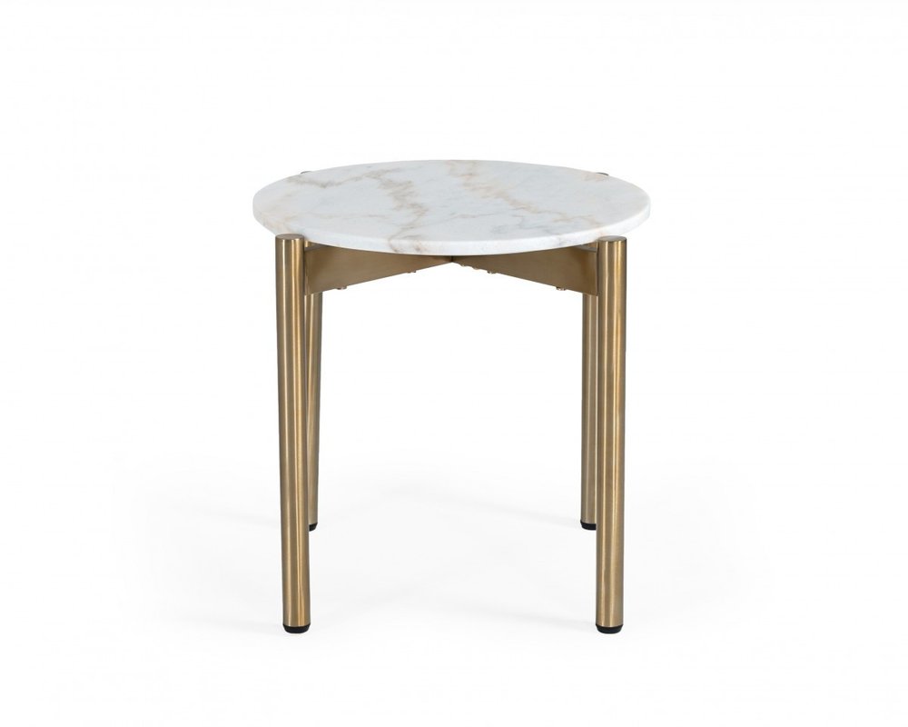Show off your exquisite taste with this 22" gold and white marble stone and metal round end table. The base of this table is made from metal in a gold color that is a nice contrast to the white marble stone tabletop. This table will bring some modern chic and luxurious vibes to your space. A great accent on either side of the sofa or bed, this adorable end or side table is just what you need. You can match it with other pieces to get the ideal look for your place. 21.5" H x 21.5" W x 21.5" D
