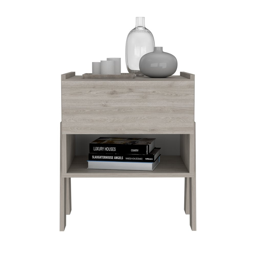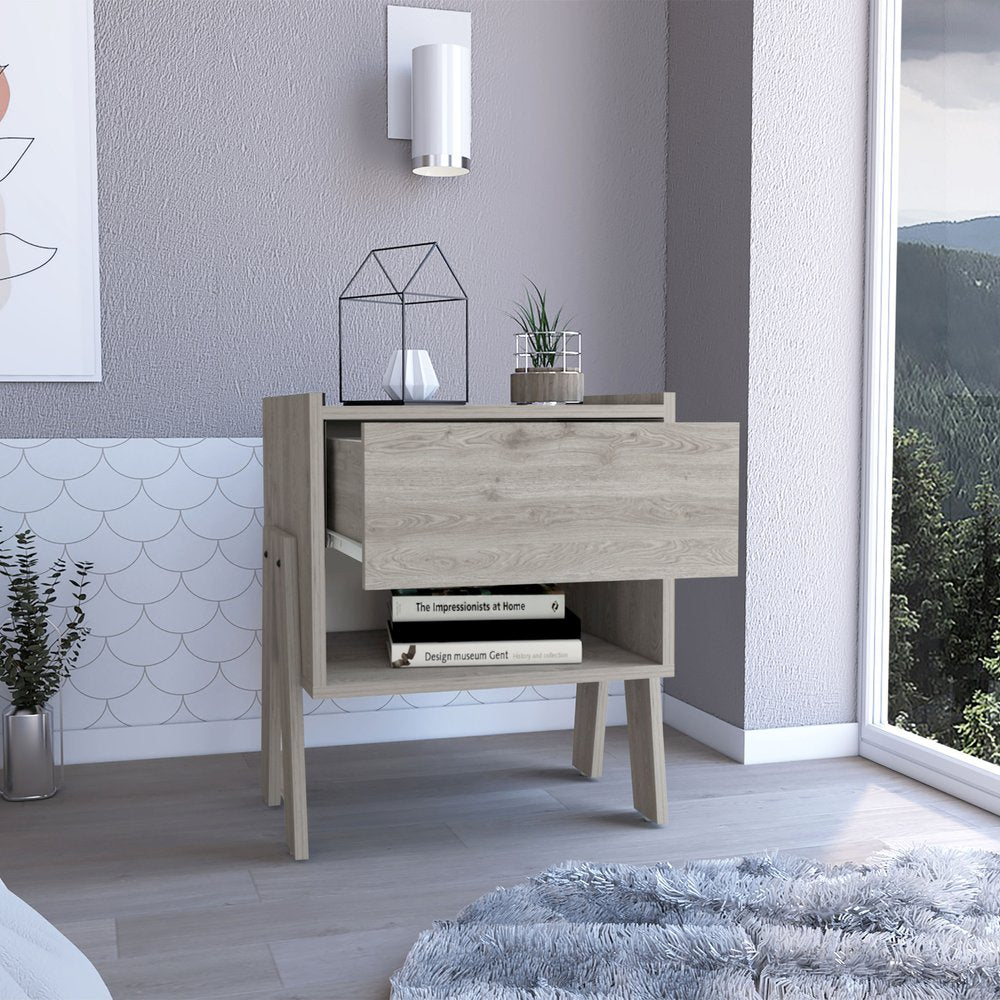 Our 22-inch gray wood one drawer nightstand will compliment your bed beautifully. Made of high quality manufactured wood that is built to last. Includes a drawer to help keep your essentials close by and hidden. An easy-access shelf gives you additional storage and display space. The unsung hero of the bedroom, this nightstand is perfect for keeping a glass of water, lamp, alarm clock, jewelry, and more, close by and easily accessible. Look no further than this nightstand to accommodate all your needs and upgrade the style of your bedroom. 21.8-inch h x 18.8-inch w x 15.7-inch d.