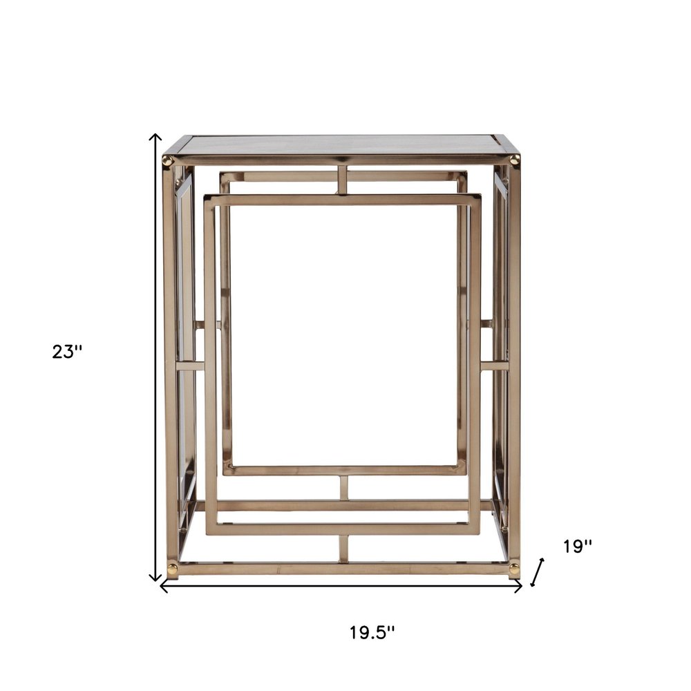 Distinctive in style, the 23" champagne glass and iron square end table radiates a versatile charm. Artfully crafted of metal, this beautiful design is chock-full of fine details. A sleek champagne monotone color gives this iron and glass table a fresh and updated look. Side tables are a great way to flank your sofa, use as an accent next to your favorite chair, or can even be used bedside. This versatile table is a great accent for almost any room. 23" H x 19.5" W x 19" D