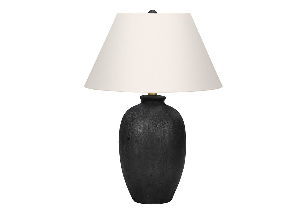 With this 24-inch black ceramic round table lamp with ivory empire shade you can bring in design to any space along with adding some ambient lighting. The lamp is made of sturdy ceramic and features a black color. Includes a ivory linen, empire shaped shade, making this a fashionable piece that will complement most any interior. This standard table lamp is designed to provide general lighting to the area. High quality design makes this a great lamp for not only lighting, but accenting a room with style. The perfect lamp to create just the right natural and soothing light in your space. 24-inch H x 17-inch W x 17-inch D