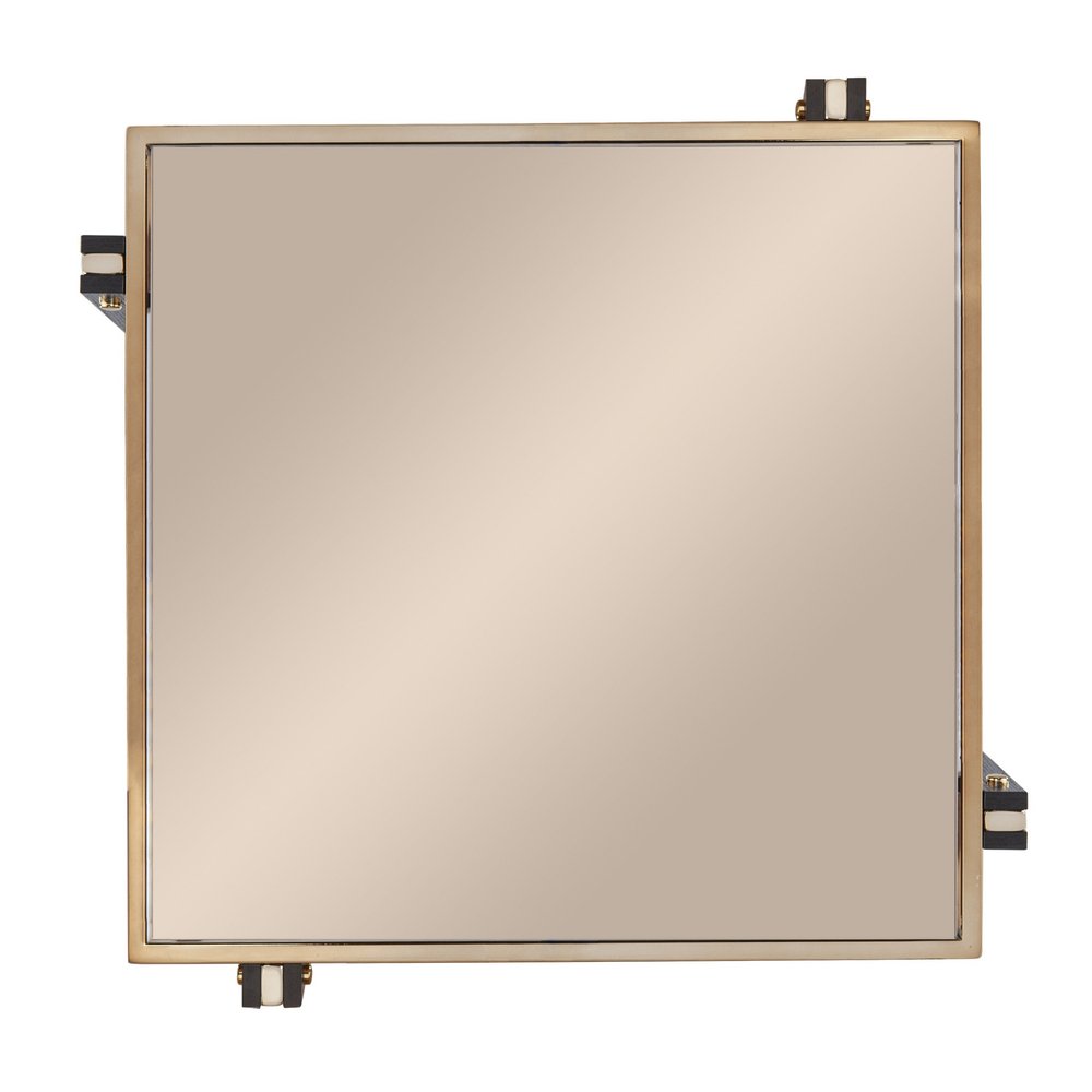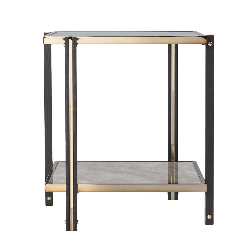 Distinctive in style, the 24" champagne glass and iron square mirrored end table with shelf radiates a versatile charm. This multi-functional end or side table is built to last from high quality metal. A sleek champagne monotone color gives this iron and glass table a fresh and updated look. Reflective pieces of mirrored glass give this table a glamorous and unique look. Includes a single shelf for handy storage or display space. An ideal location for placing your snacks and drinks, and a place to keep your lamp, frames, or other accessories. You can match it with other pieces to get the ideal look for your place. 24" H x 22.25" W x 22.25" D