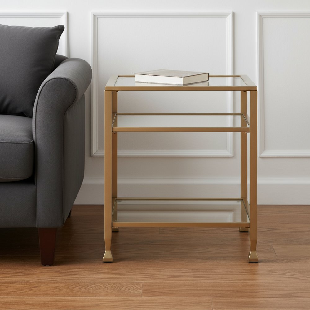 Optimize your space and add some charm to your room with the 24" gold glass and iron rectangular end table with two shelves. The gold coloration runs throughout this good looking iron and glass table. There are two shelves that will help to keep clutter at bay. An ideal location for placing your snacks and drinks, and a place to keep your lamp, frames, or other accessories. You can also use it as an entryway table to hold your keys. 24" H x 16.5" W x 20.5" D