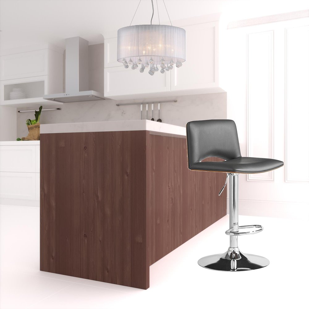 This 42" gray faux leather and manufactured wood swivel low back adjustable height bar chair will be the perfect way to add some cool design and utility to your space similar to what you find in your favorite cafes or pubs. The walnut coloration of the high quality manufactured wood base marries nicely with the gray faux leather seat. A low back mixed with a round shaped seat design makes this chair both comfortable and fashionable. This stool will look great in your dining room, kitchen, bar, or recreation room. 42" H x 18" W x 20" D