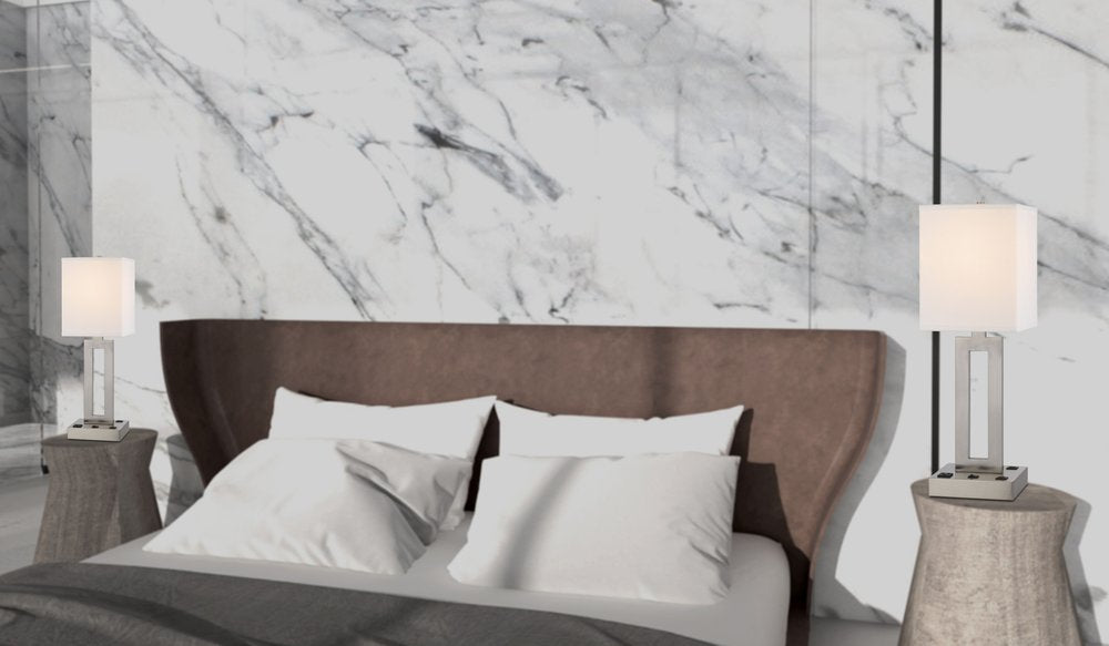 Add a bright anchor to your room with this 24" nickel metal desk usb table lamp with white drum shade. The base of this lamp is made of metal finished in a nickel tone. The white shade has a drum shape and is made of fabric, which makes it a perfect choice. This desk lamp provides 'task lighting' that will illuminate your working area for reading or writing. Use this lamp anywhere and elevate the look of the whole space. The perfect lamp to create just the right natural and soothing light in your space. 24" H x 8" W x 8" D