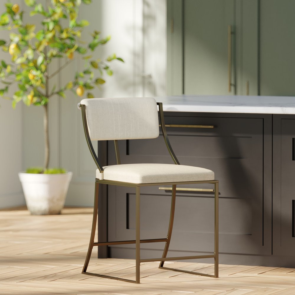 25" Beige And Antiqued Brass Steel Low Back Counter Height Bar Chair