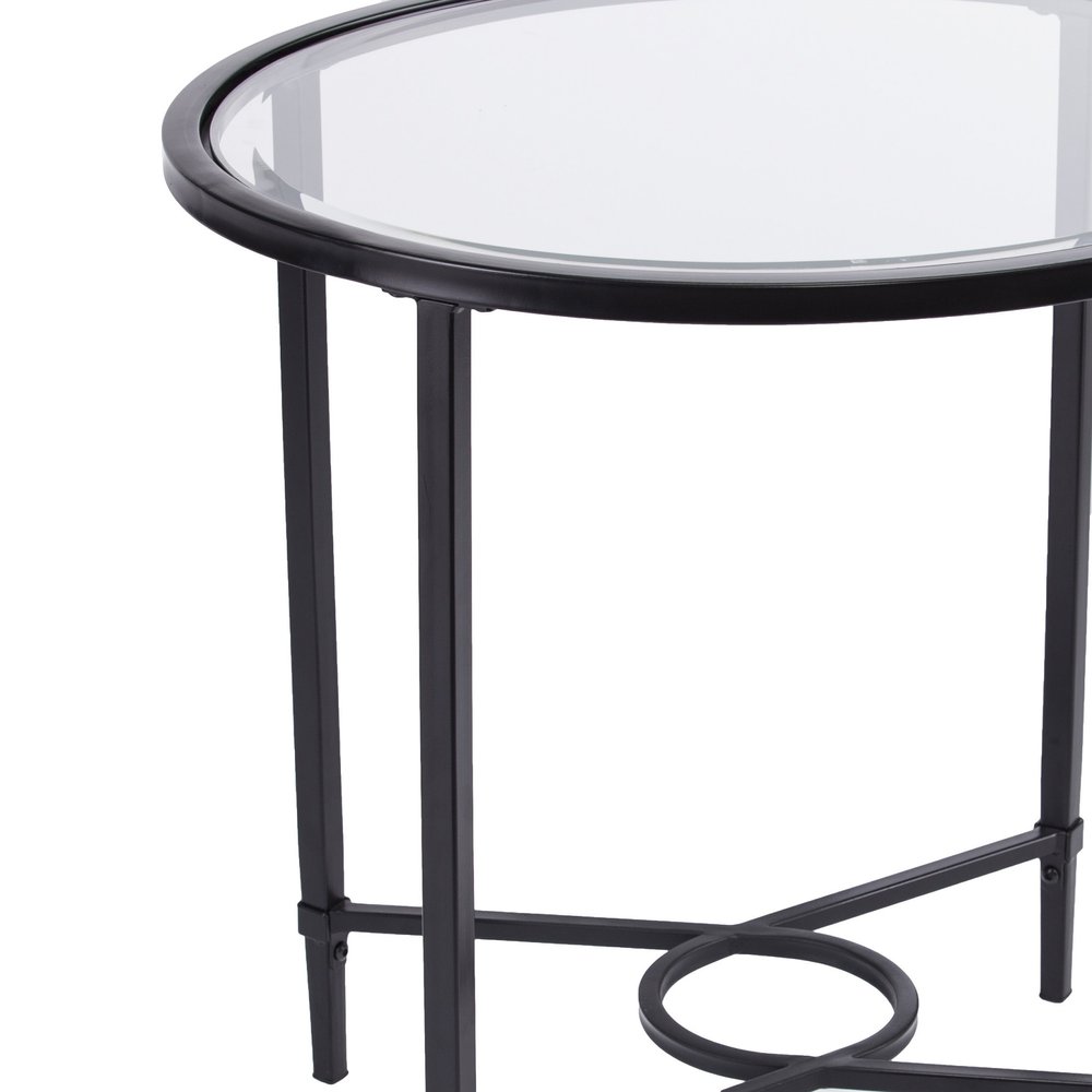 Distinctive in style the 25-inch black and clear glass oval end table radiates a versatile charm. The black coloration of the high quality iron base marries nicely with the clear glass top. An ideal location for placing your snacks and drinks, and a place to keep your lamp, frames, or other accessories. You can match it with other pieces to get the ideal look for your place. 24.75-inch H x 25-inch W x 21-inch D