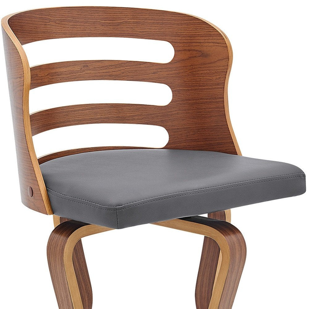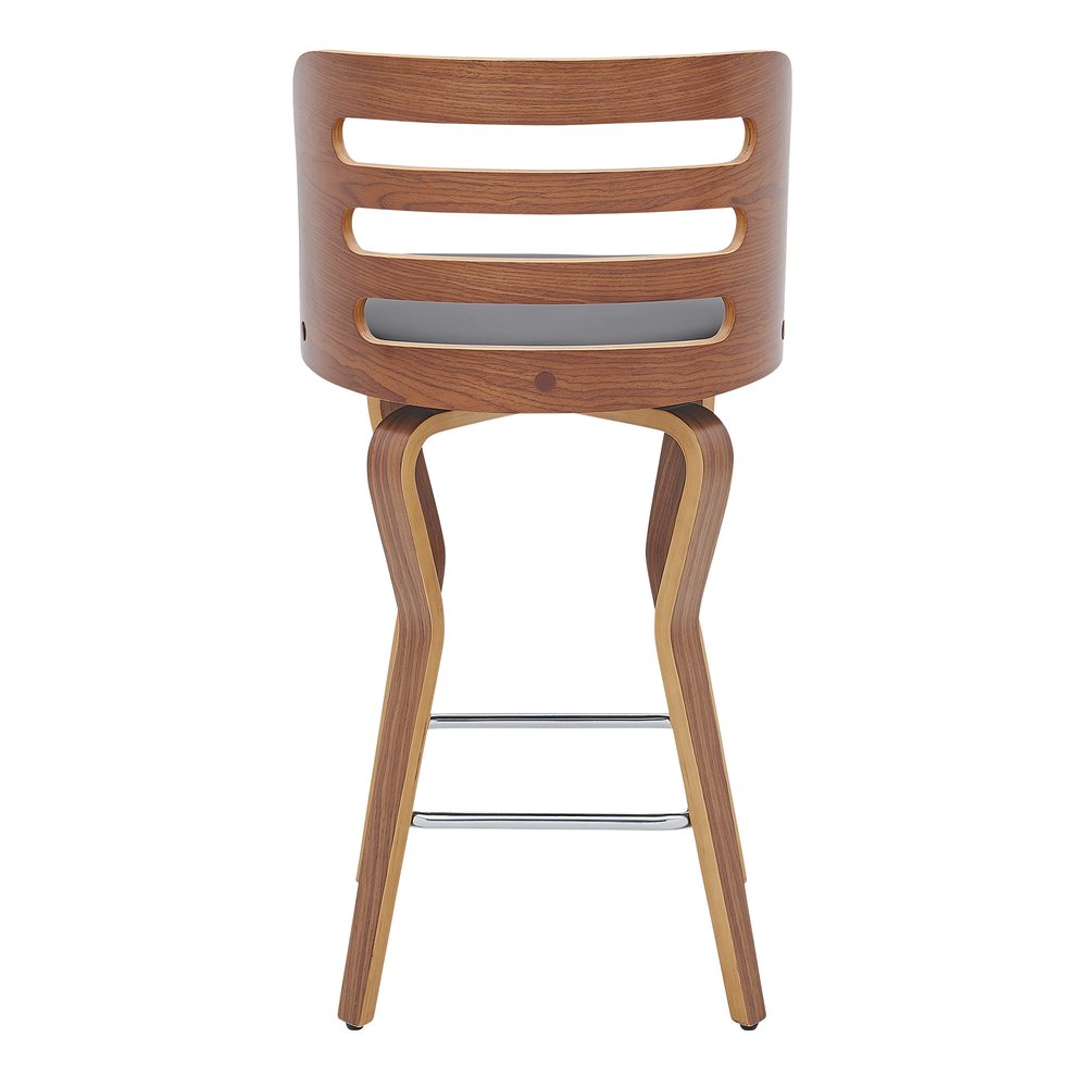 This 25-inch gray and brown faux leather low back counter height swivel bar chair will be the perfect way to add some cool design and utility to your space similar to what you find in your favorite cafes or pubs. The brown coloration of the high quality manufactured wood base marries nicely with the gray faux leather seat. The round shape of the seat combines with a low back to give this chair a comfortable and fashionable look. Designed with a footrest for comfort and convenience. 35-inch H x 18-inch W x 19-inch D