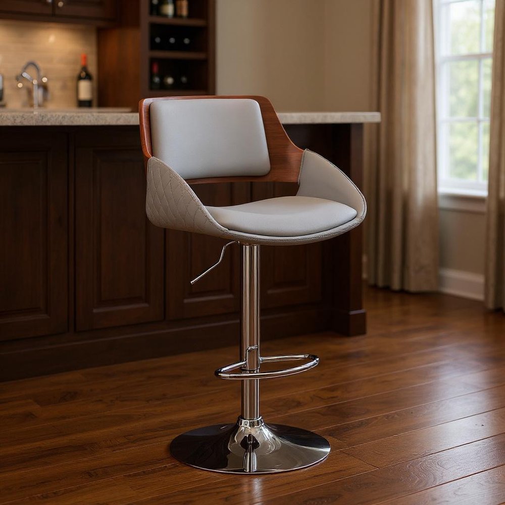 Elevate your home decor with this Grey Faux Leather Adjustable Bar Stool Finished in Chrome. You can immediately tell that this simple yet classic design will be a great fit for many spots across the home. Its versatility is beyond imagination as you can use it in your peninsula counter or home bar where you seat comfortably and make the most of life. This special piece of furniture is adorned in luxurious faux leather, with the cushioned seat featuring a novel shape that makes it a great place to relax. Thankfully, the seat is adjustable, so you can always adjust it to your preferred height, leaving you in total control of how you seat. The chrome support has a footrest that allows you to enjoy more convenience while you're seated. 43 x 21 x 20