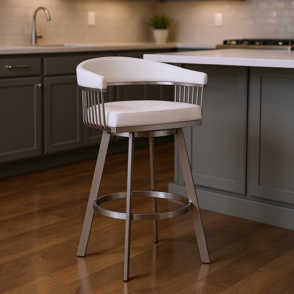 Experience the true meaning of luxury with this 26" Mod White Faux Leather Brushed Silver Finish Swivel Bar Stool . This stool is a great way to beautify your home without ever compromising on functionality. Featuring a comfortable curved open back with stainless steel and faux leather accents, this chair has a unique and contemporary feel. The sides are an open and airy rounded bar design and a footrest provides some added convenience and stability while seating. The combination of the soft faux leather seat cushion and back mixed with the sturdy steel makes this eye-catching design that is built to last. The stool also comes with a full 360-degree swivel effect so you can enjoy your conversations facing your preferred direction without a feeling of discomfort. 34" x 22" x 21"