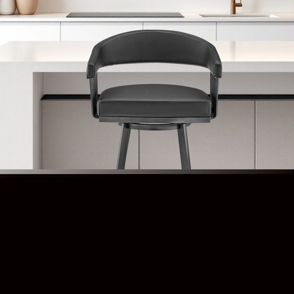 This 26-inch black faux leather and iron low back counter height swivel bar chair will be the perfect way to add some cool design and utility to your space similar to what you find in your favorite cafes or pubs. The base of this stool is made from iron in a black, that matches the faux leather, also in black. The bucket shape of the seat combines with a low_back to give this chair a comfortable and fashionable look. Designed with armrests for your comfort, this chair also features a footrest for comfort and convenience. 34-inch h x 22-inch w x 21-inch d.