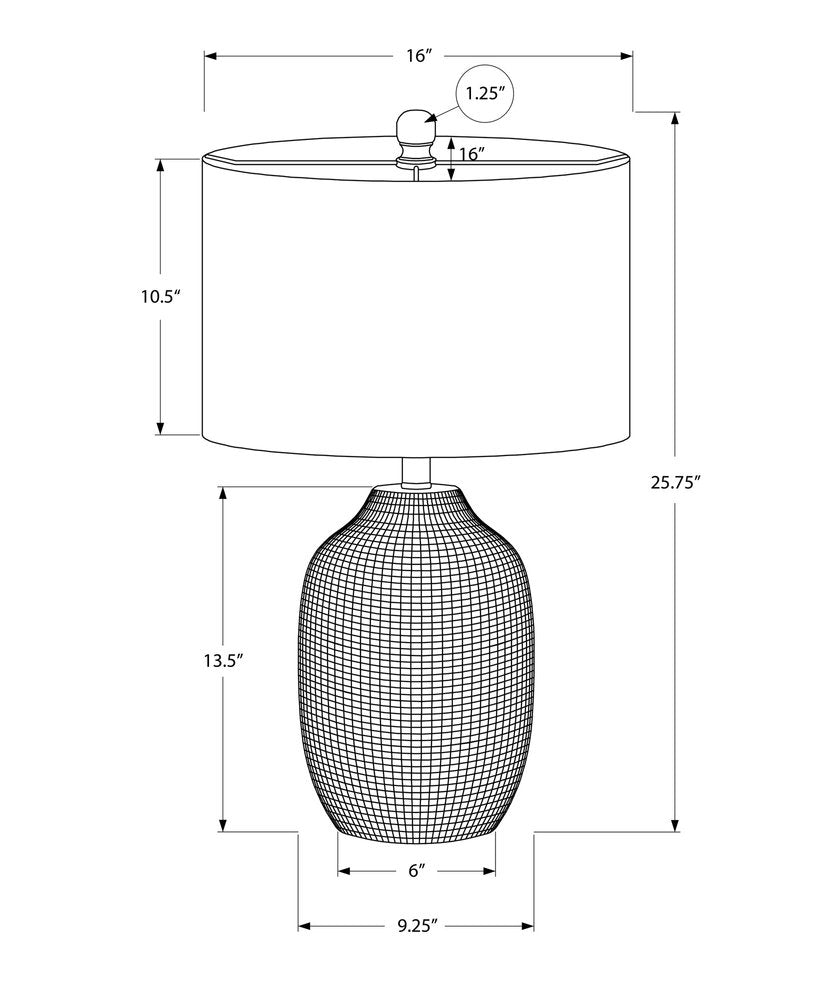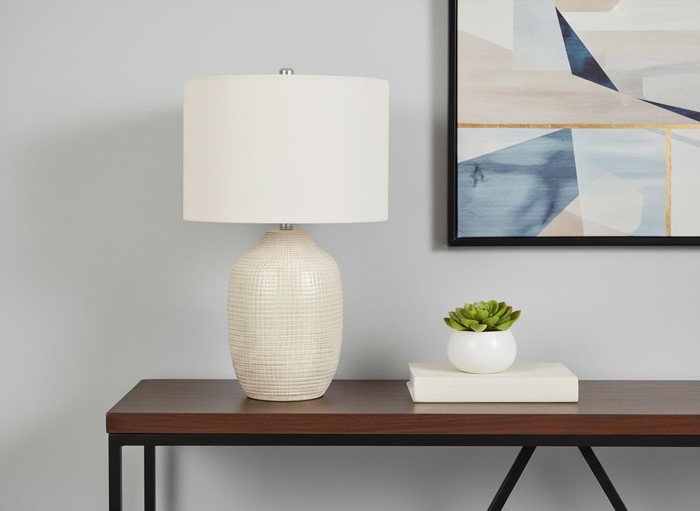Bring of level of elegance and freshness to your space with this high quality 26-inch cream ceramic urn table lamp with cream drum shade. The base of this lamp is made of a gorgeous cream glazed ceramic with a geo texture design. The ivory/cream shade has a drum shape and is made of linen, which makes it a perfect choice. This standard table lamp is designed to provide general lighting to the area. The light that this lamp throws is soft and warm to elevate the look of most any space in your home. It is perfect for virtually any decor. 25.75-inch H x 16-inch W x 16-inch D