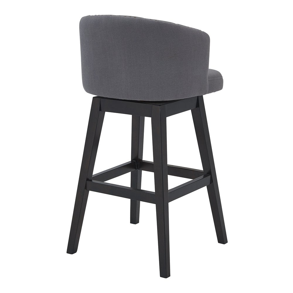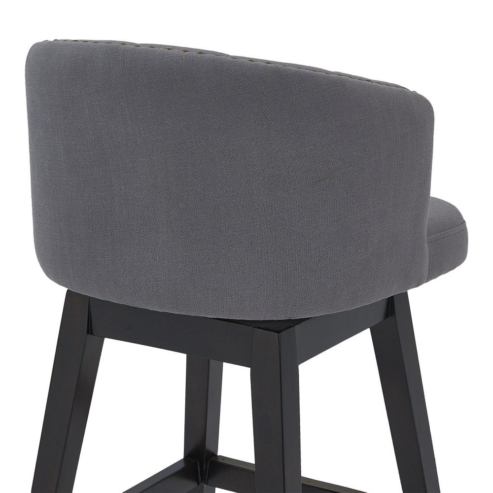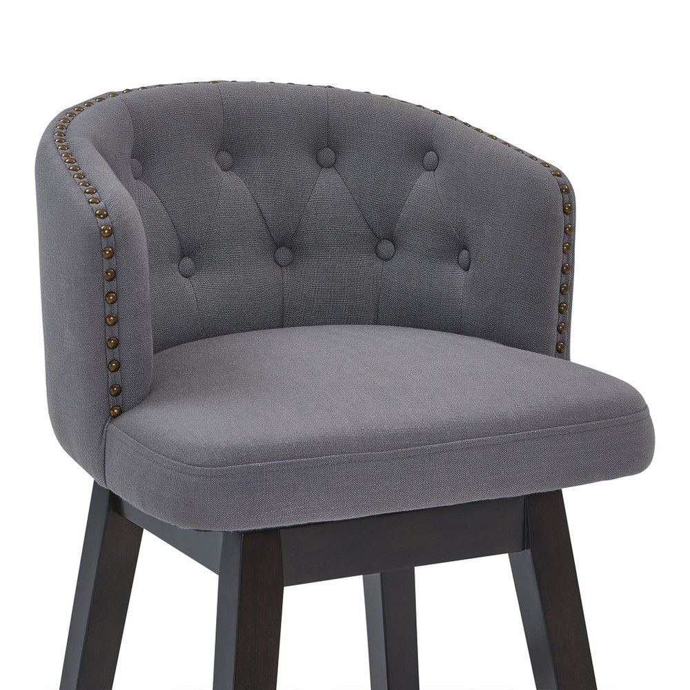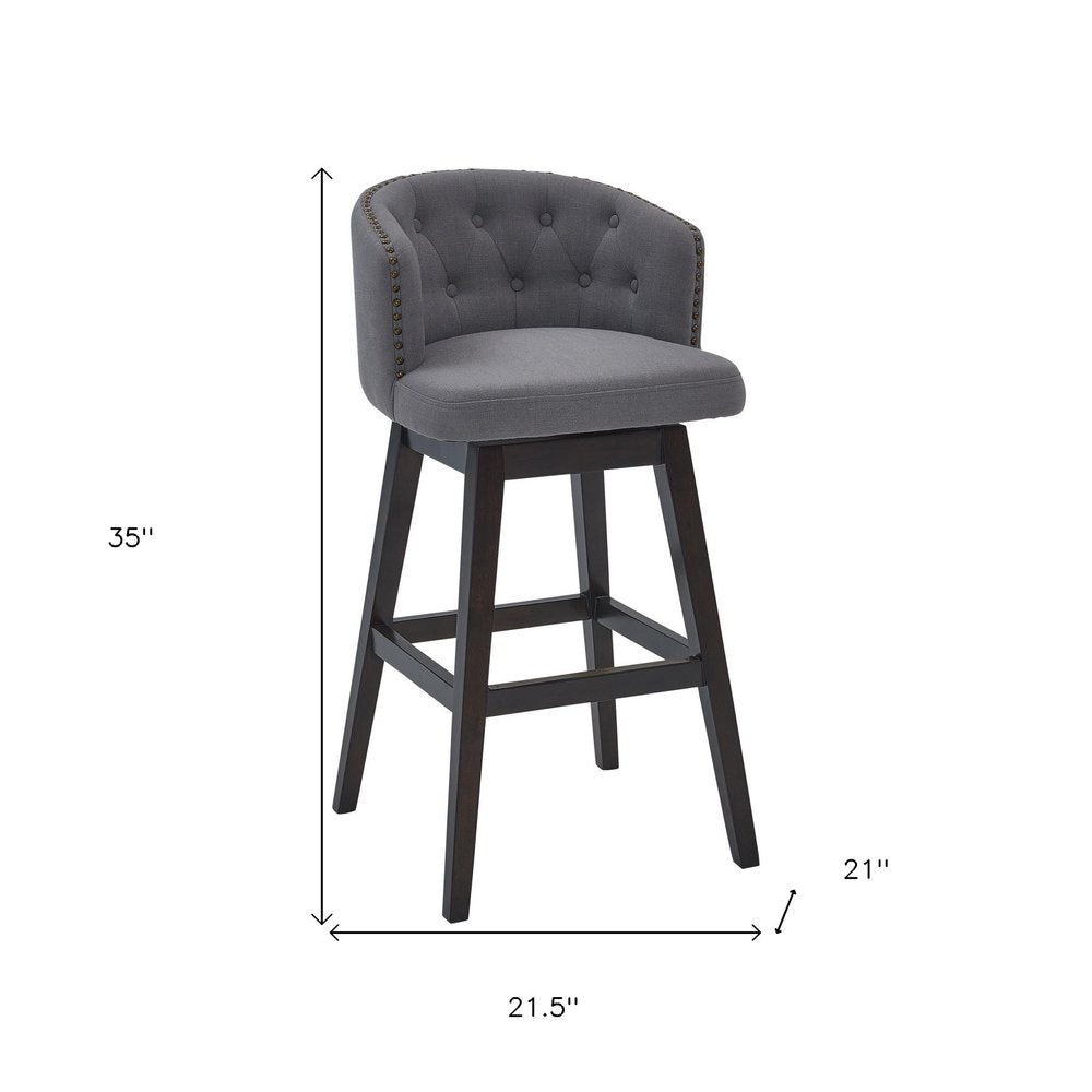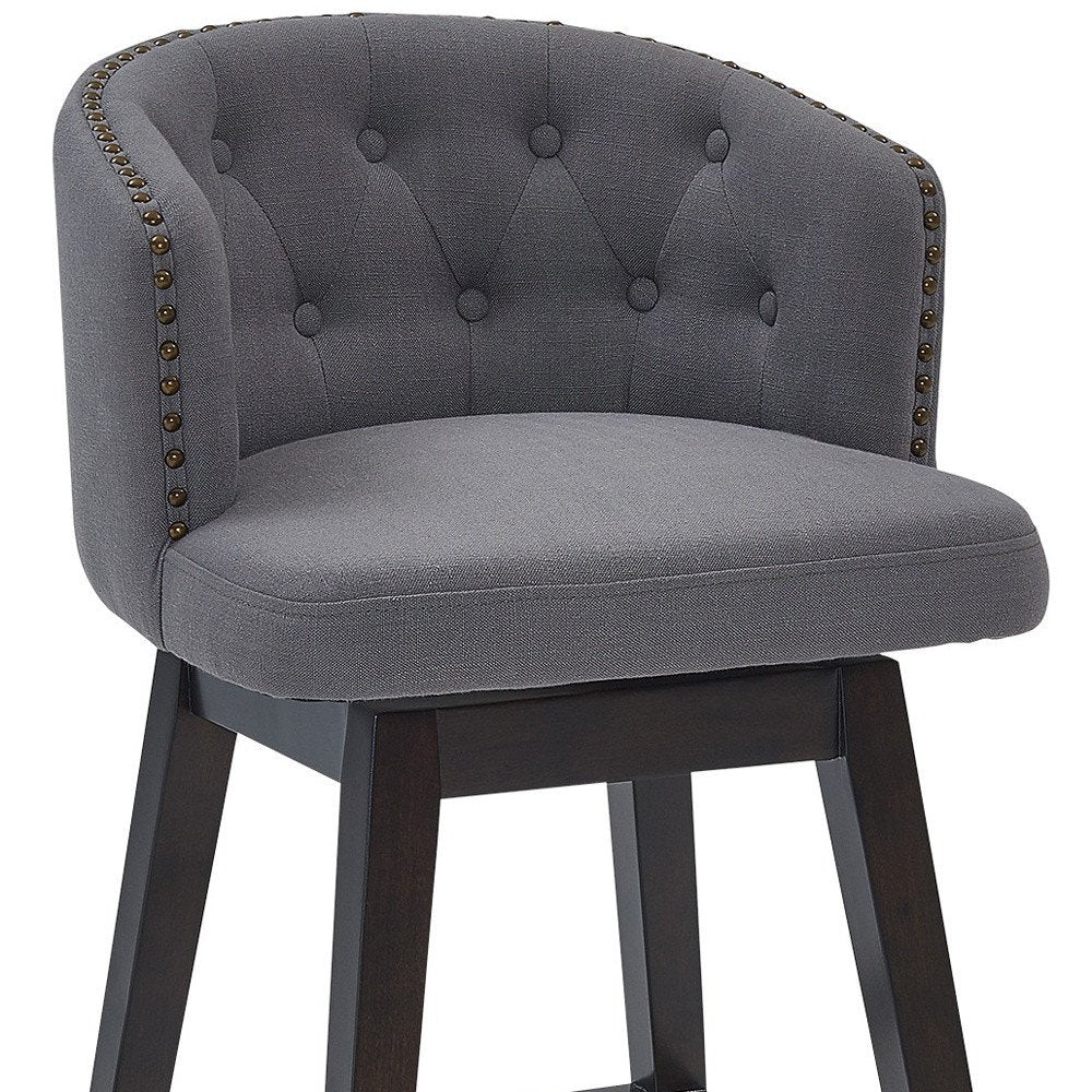 This 26" Grey Tufted Fabric and Dark Espresso Wood Swivel Bar Stool is the perfect choice for anyone who wishes to enjoy comfort at its best. The stool is upholstered in grey fabric wrapped around plush cushioned seat with a rounded back and high-end tufted diamond stitching. This creates a special effect that makes the stool even more appealing to the eyes. It allows you to enjoy comfort and features beautiful nail head trim accents. You can be sure the bar stool won't damage your floors, thanks to the floor protectors that are featured on the legs. The dark espresso wood finish marries perfectly with the slate gray of the fabric complemented by the elegant silhouette. 35 x 21 x 21.5