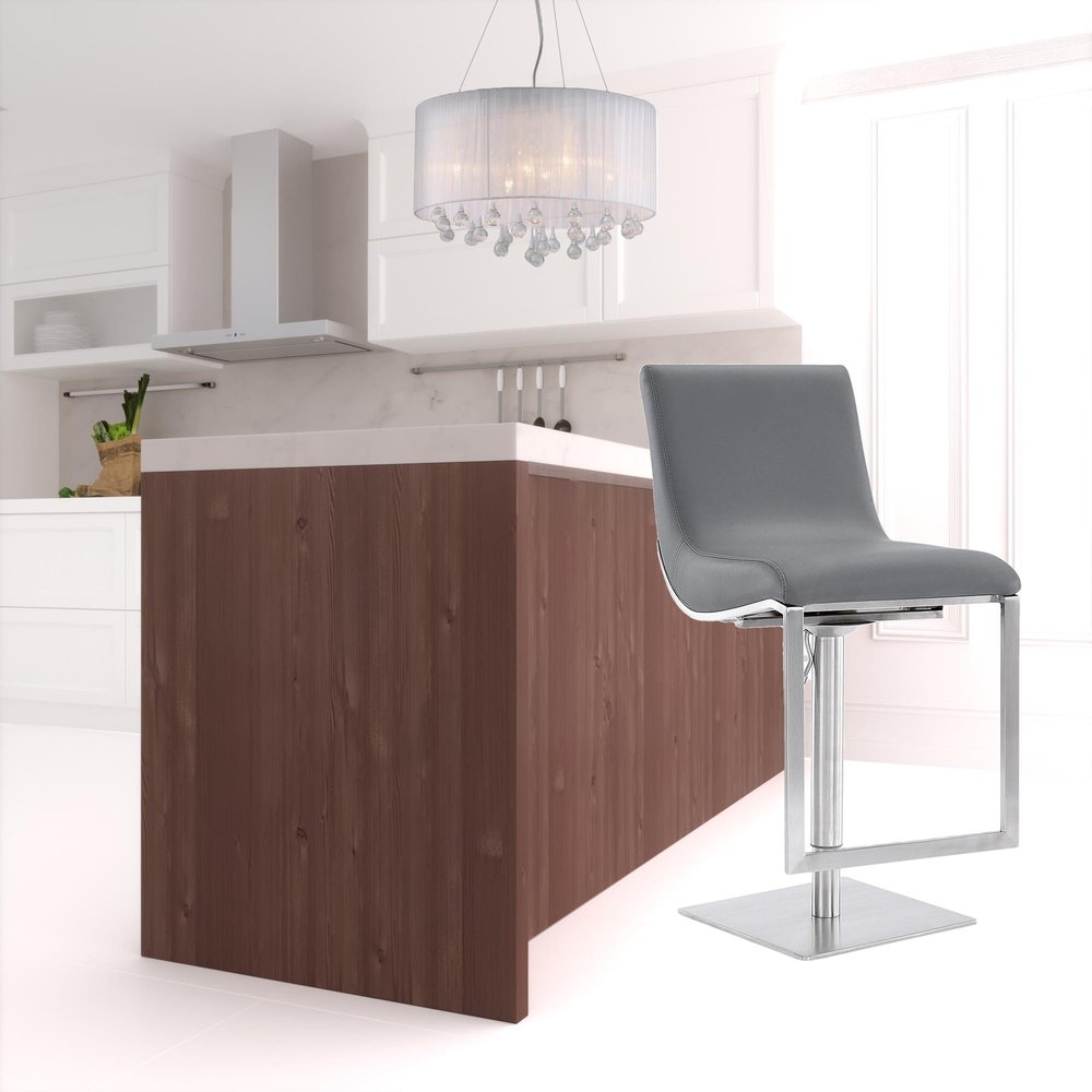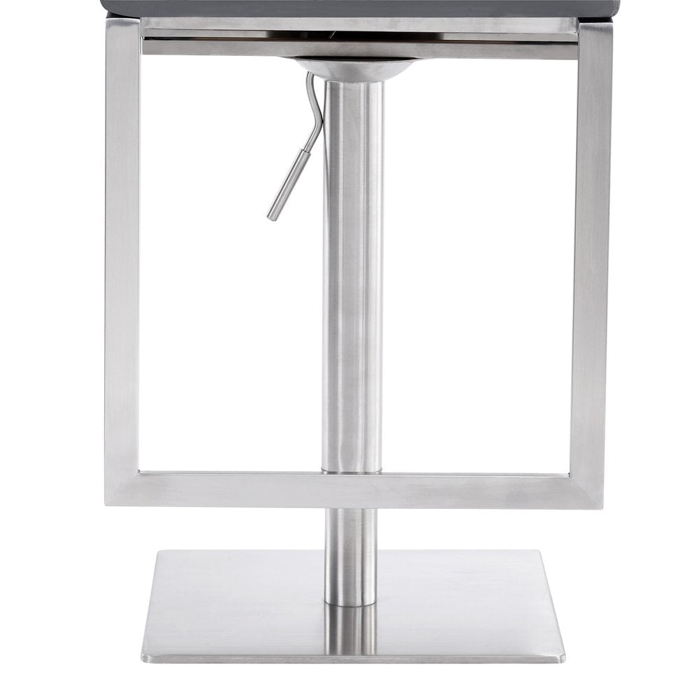 The perfect way to add some extra seating in your home, this 47" gray faux leather and iron swivel adjustable height bar chair will elevate the look and vibe of your room. The brushed stainless steel coloration of the high quality iron base marries nicely with the gray faux leather seat. Not only good looking and stylish, this chair features a round shaped seat and a full back for the ultimate in comfort and enjoyment. This stool will look great in your dining room, kitchen, bar, or recreation room. 46.5" H x 17" W x 24" D