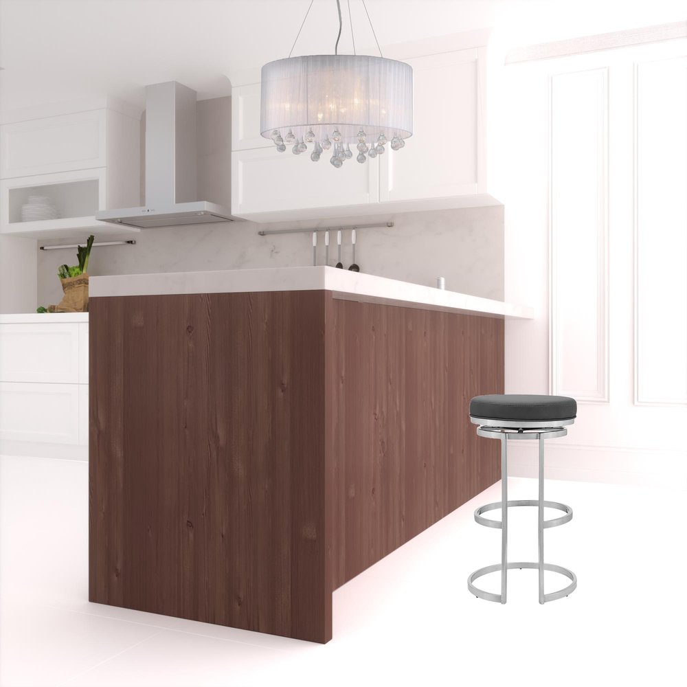 Bring a trendy bar vibe to your space, with this 26" gray faux leather and iron swivel backless counter height bar chair. The gray faux leather seat of this stool is a nice contrast to the high quality, brushed stainless steel iron of the base. Designed to be good looking and practical, this backless bar chair features a round shaped seat. A great seating option, this stool will bring a unique look to any room. 26" H x 17" W x 17" D