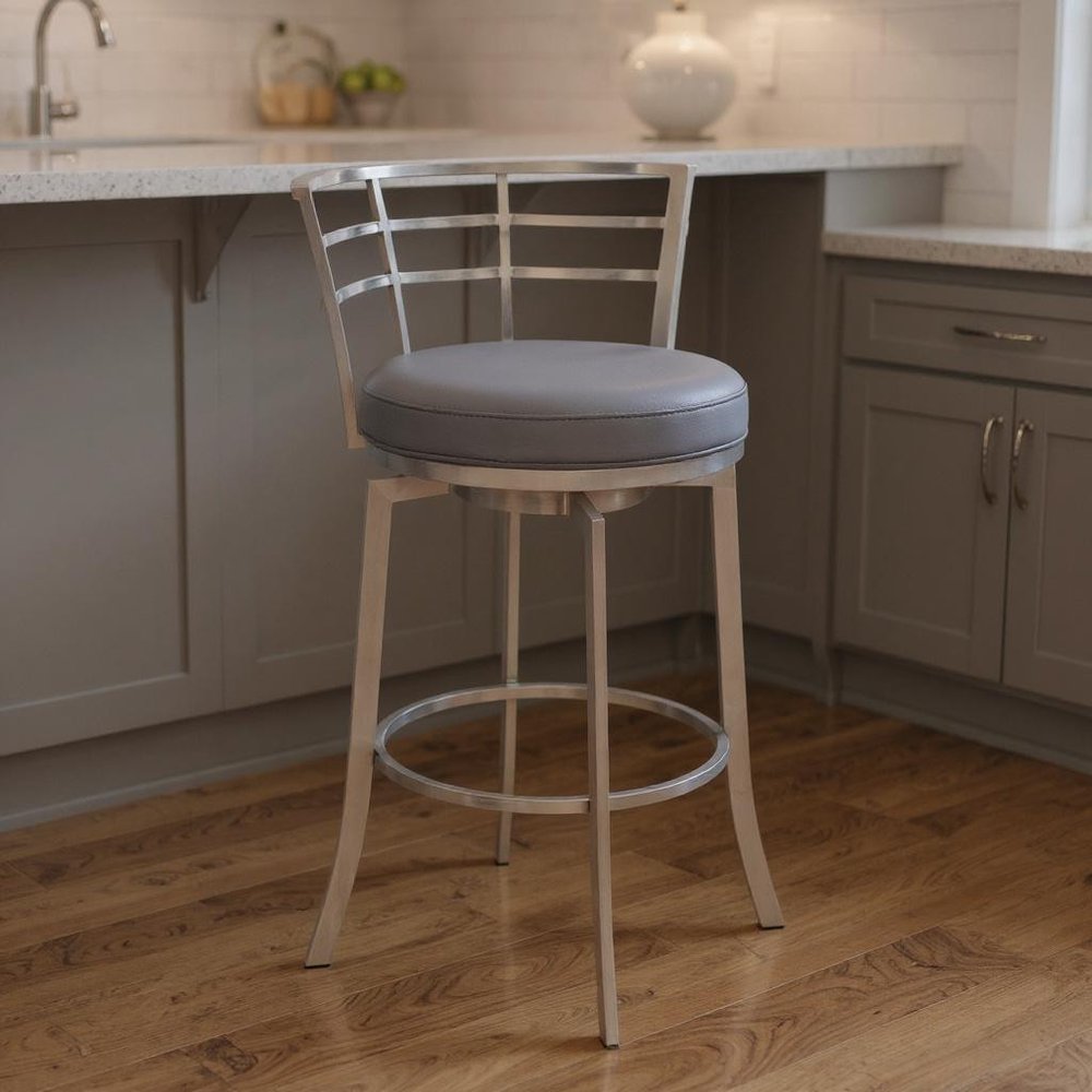 The perfect way to add some extra seating in your home, this 35" gray faux leather and iron swivel low back counter height bar chair will elevate the look and vibe of your room. The brushed stainless steel coloration of the high quality iron base marries nicely with the gray faux leather seat. The round shape of the seat combines with a low back to give this chair a comfortable and fashionable look. This stool will look great in your dining room, kitchen, bar, or recreation room. 35" H x 20" W x 21" D