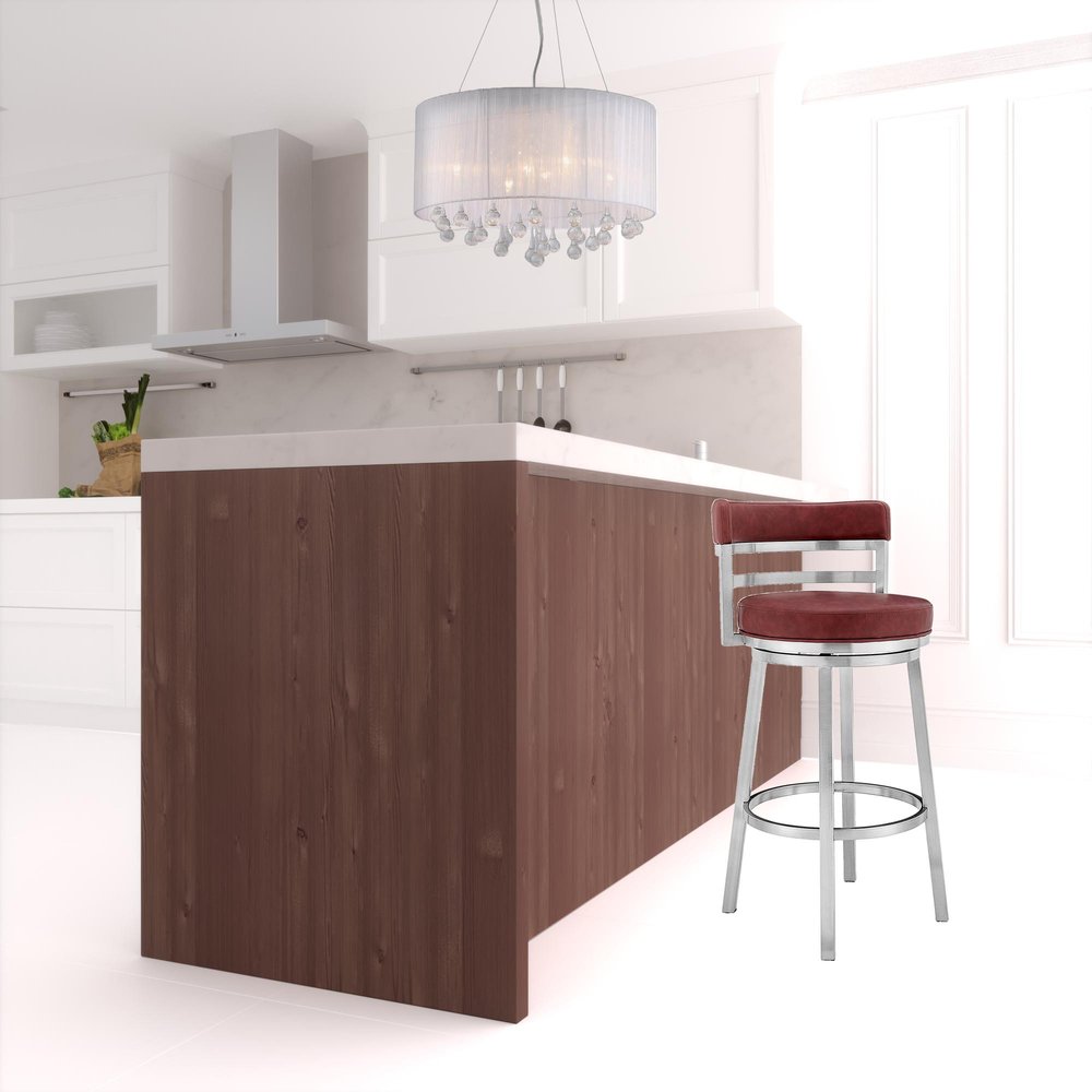 With this 36" red and silver faux leather and iron swivel low back counter height bar chair with footrest you can add design and extra seating to your space. A silver iron frame is finished off with a red faux leather seat that is the epitome of quality construction and design. A low back mixed with a round shaped seat design makes this chair both comfortable and fashionable. Designed with a footrest for comfort and convenience. 36" H x 20" W x 21" D
