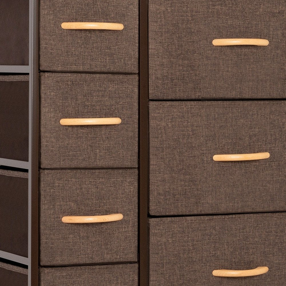 Make your room functional and visually enticing with this masterful 27" brown steel and fabric nine drawer combo dresser. This combo dresser gives you the added bonus of both drawer storage and cabinet storage to accommodate various sizes and types of items. Loaded with maximum capacity, this piece is equipped with nine easy open drawers for practical and good looking clothing storage. Its a high quality piece, made from high grade steel and fabric. Removable drawers give this chest flexibility and multi-functionality. 37.4" H x 26.8" W x 11.8" D