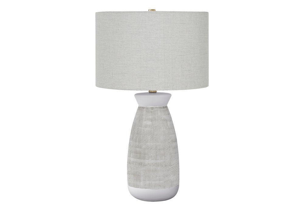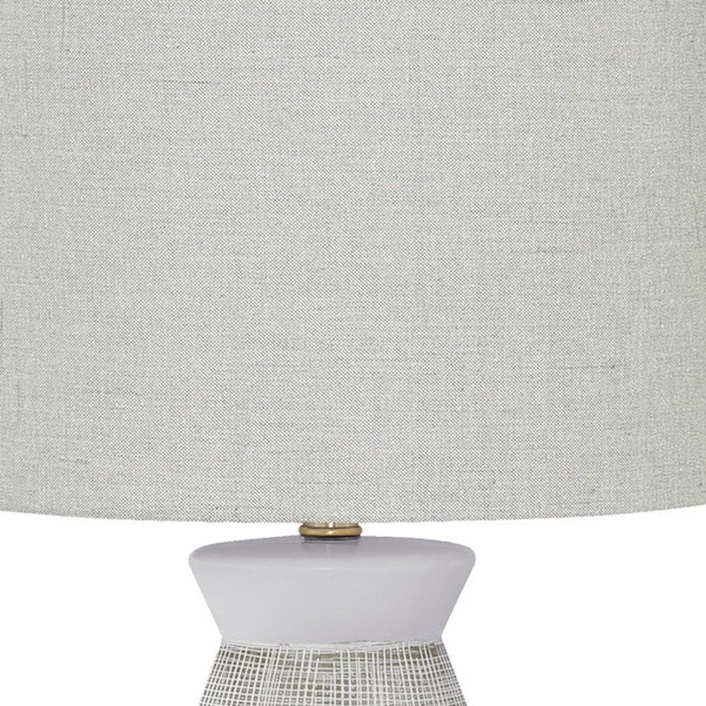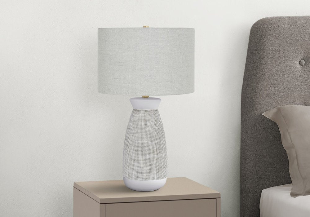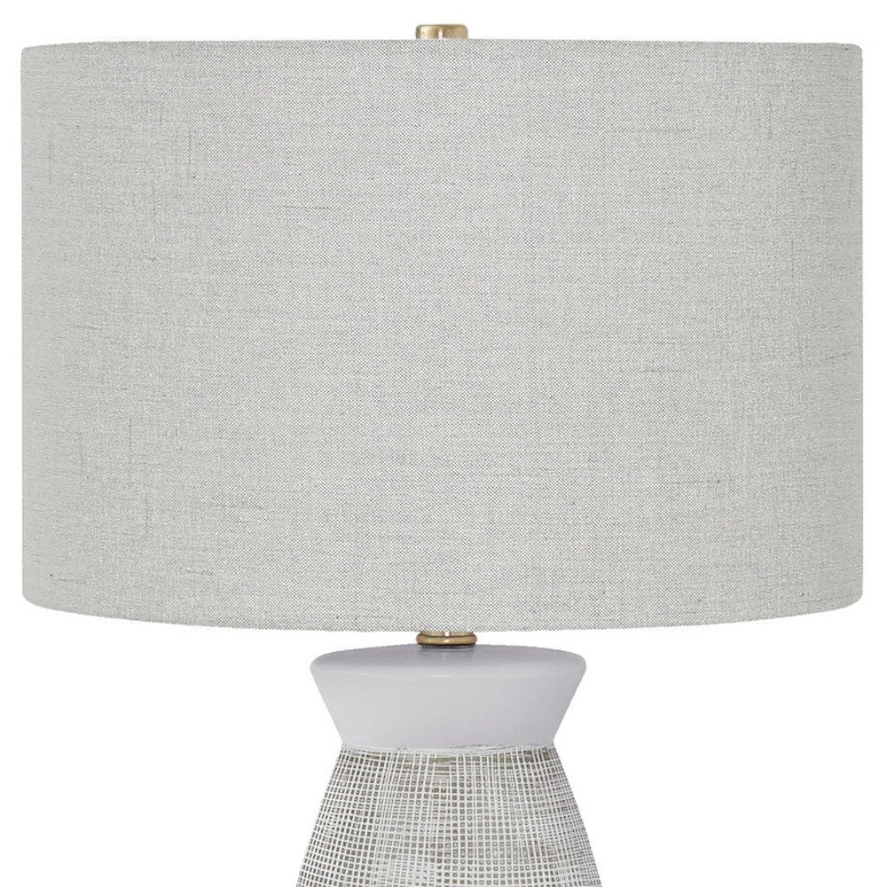 Truly a mix of design and functionality that doesn't compromise on style, this 27-inch gray and white ceramic round table lamp with gray drum shade will be a great addition to your space. A gorgeous gray and white textured ceramic base brings just the right amount of pizzazz to this fabulous lamp. The gray shade has a drum shape and is made of linen, which makes it a perfect choice. This standard table lamp is designed to provide general lighting to the area. Use this lamp anywhere and elevate the look of the whole space. Bring some lite and good vibes into your space with this updated and stylishly designed lamp. 26.5-inch H x 15.5-inch W x 15.5-inch D