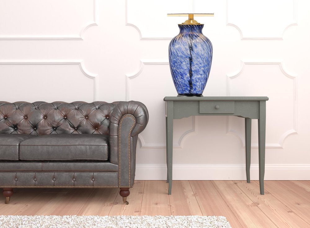 This 28" blue swirl glass table lamp with white empire shade is the perfect combination of design and function. The base of this lamp is made of metal and glass finished in a blue tone. Includes a white linen, empire shaped shade, making this a fashionable piece that will complement most any interior. This standard table lamp is designed to provide general lighting to the area. High quality design makes this a great lamp for not only lighting, but accenting a room with style. It is perfect for virtually any decor. 28" H x 16" W x 16" D