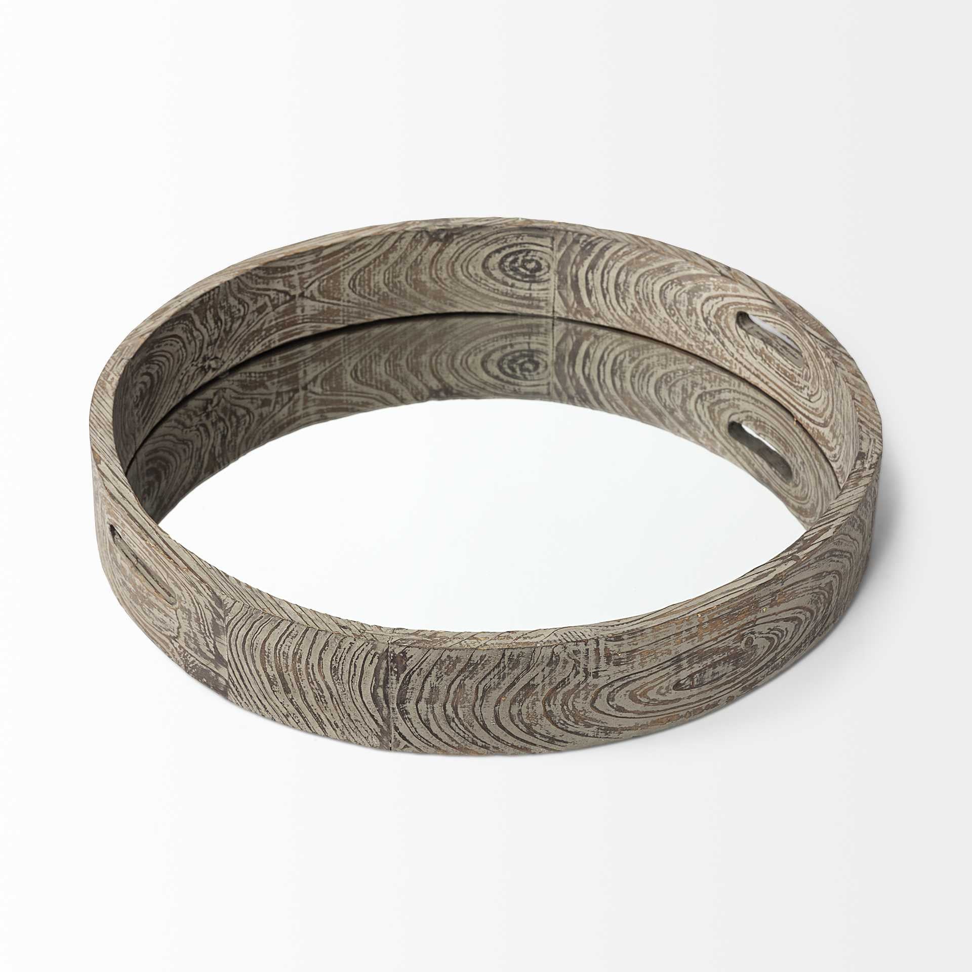 This round wood tray exudes elegance with its classic design and durable build. Crafted from genuine wood, it features handles for easy transport, making it both stylish and practical. Ideal for serving food safely with its food-safe finish, this contemporary tray in natural and brown hues is suitable for outdoor use, adding a touch of sophistication to any setting. 28-inch H x 28-inch W x 5-inch D
