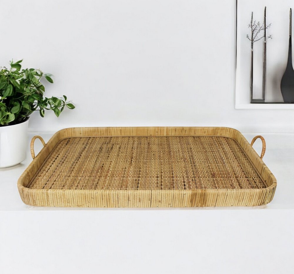 Freshen up your space with this convenient and good looking 28-inch natural rectangular bamboo handmade serving tray. This tray is made from bamboo and features a tightly woven design at the base. The rectangular edges are braided in a vertical pattern. The tray is in a natural bamboo color which has different shades in it bringing in an element of depth to the overall look. You can use this tray as centerpiece decor or you can use it serve drinks and snacks at your next dinner party. 4-inch h x 28-inch w x 18-inch d.