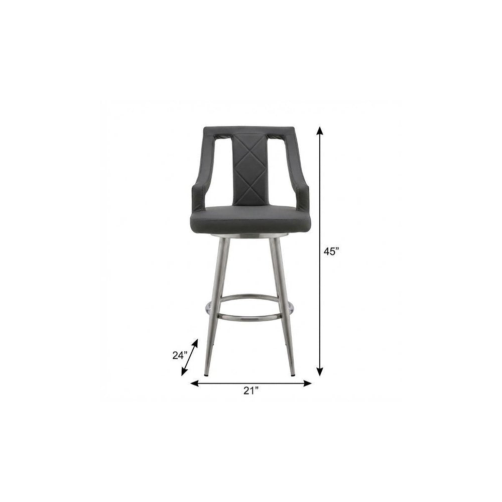 The perfect way to add some extra seating in your home, this 45" gray faux leather and iron swivel bar height chair will elevate the look and vibe of your room. A brushed stainless steel iron frame is finished off with a gray faux leather seat that is the epitome of quality construction and design. A full back mixed with a round shaped seat design makes this chair both comfortable and fashionable. The armchair design gives you a great place to comfortably rest your arms. 45" H x 21" W x 24" D