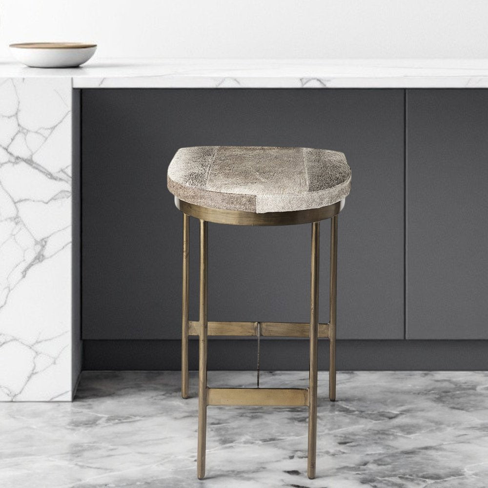 Elevate your home decor with this stylish 29-inch gray iron bar chair featuring a backless design for a modern touch. Crafted with cowhide upholstery, this chair includes a convenient footrest for added comfort and sits on four sturdy legs. The seat height is ideal for bar or kitchen islands, providing a chic seating option for entertaining guests or enjoying meals. Upgrade your space with this sleek and functional piece that effortlessly combines style and practicality. 26-inch H x 18-inch W x 16.5-inch D