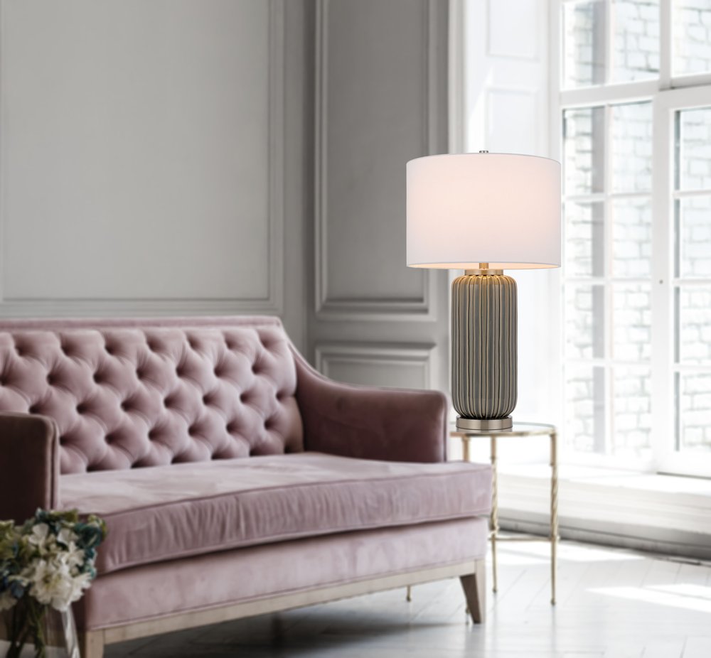Add a bright anchor to your room with this 29-inch gray metal cylinder table lamp with white drum shade. The base of this lamp is made of metal finished in a gray tone. Includes a white fabric, drum shaped shade, making this a fashionable piece that will complement most any interior. This standard table lamp is designed to provide general lighting to the area. Use this lamp anywhere and elevate the look of the whole space. It is perfect for virtually any decor. 29-inch H x 16-inch W x 16-inch D
