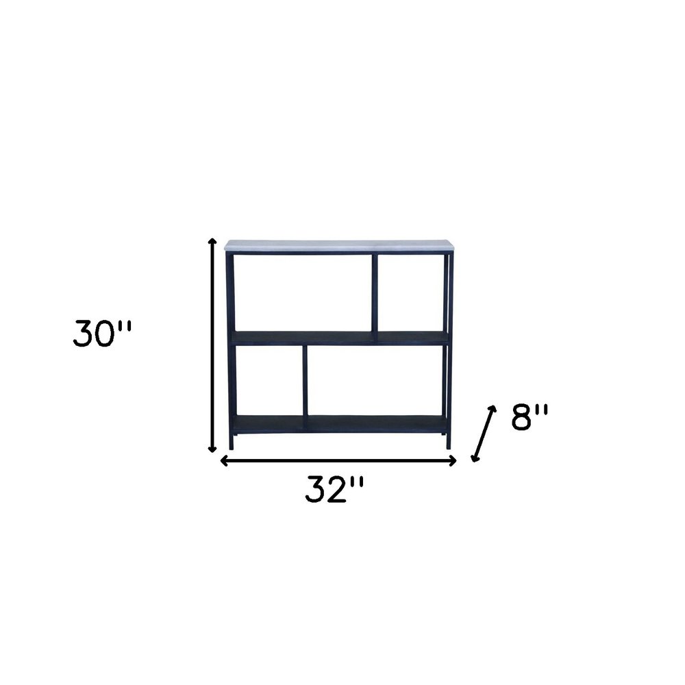 The 30-inch black and white iron three tier geometric bookcase offers you storage and display space in a good looking and refined manor. Features 3 shelf tiers for storing books, displaying photographs, plants, or other decorations. This bookcase is perfect for use alone or in multiples in most any living or office space. Increase your room's capacity for storage and display with this great shelving unit. 30-inch H x 32-inch W x 8-inch D