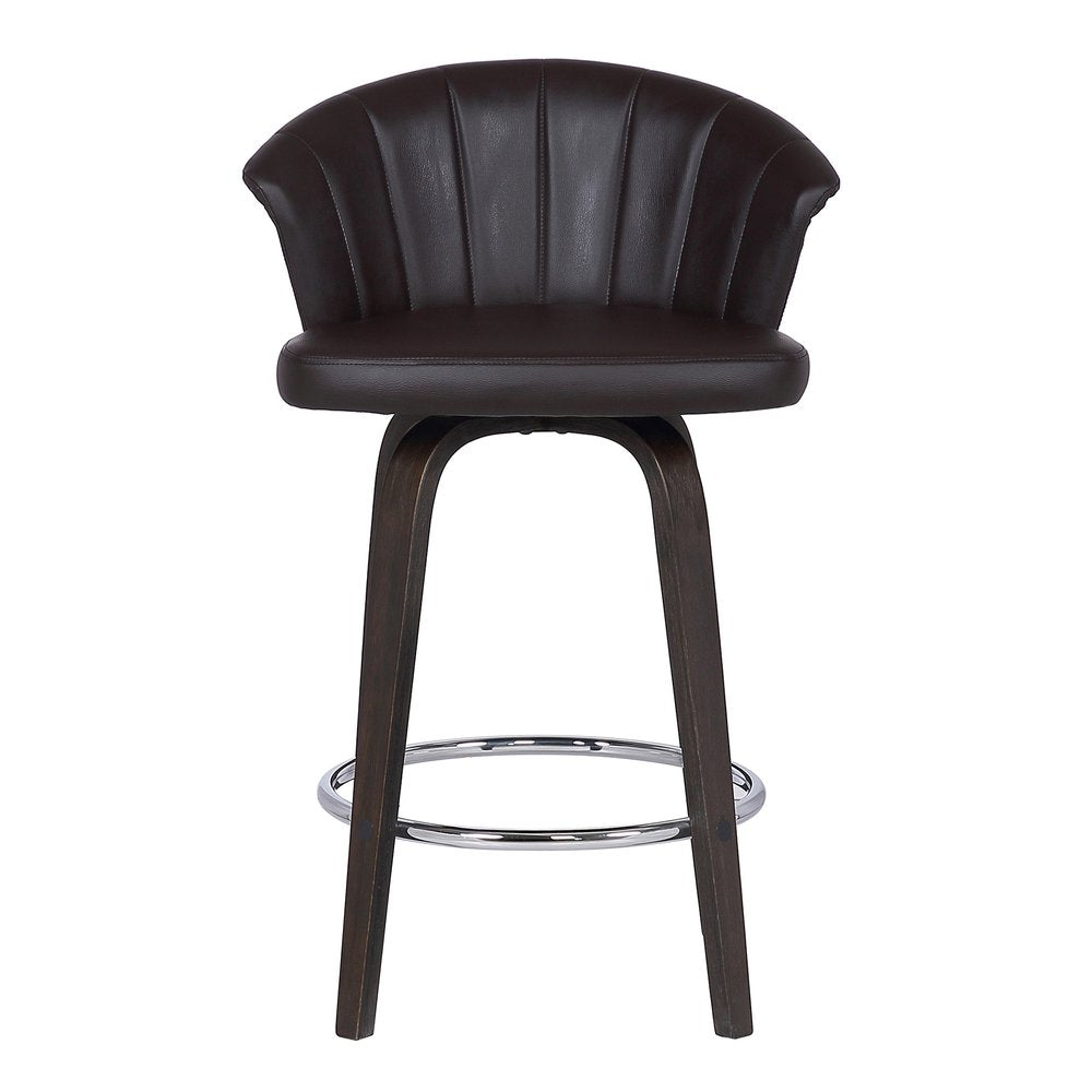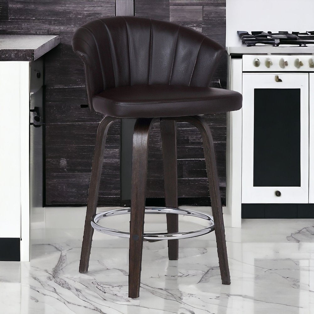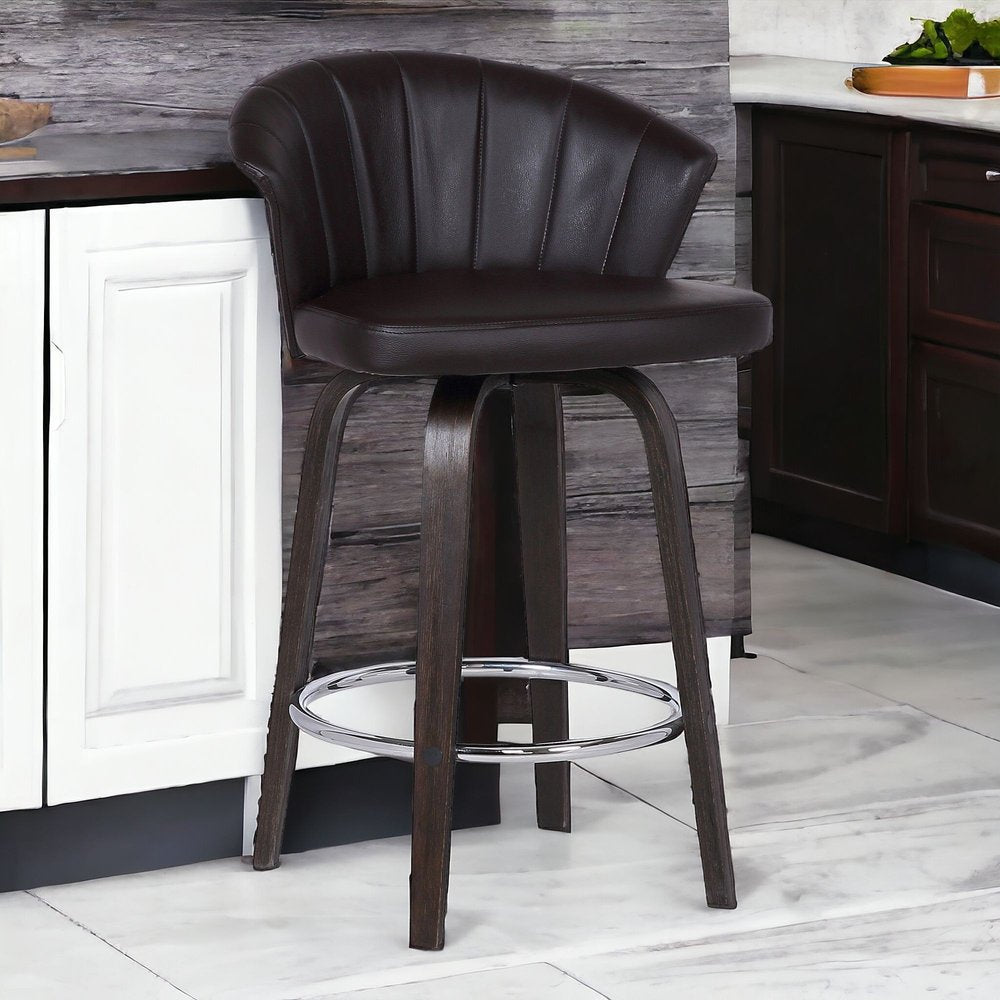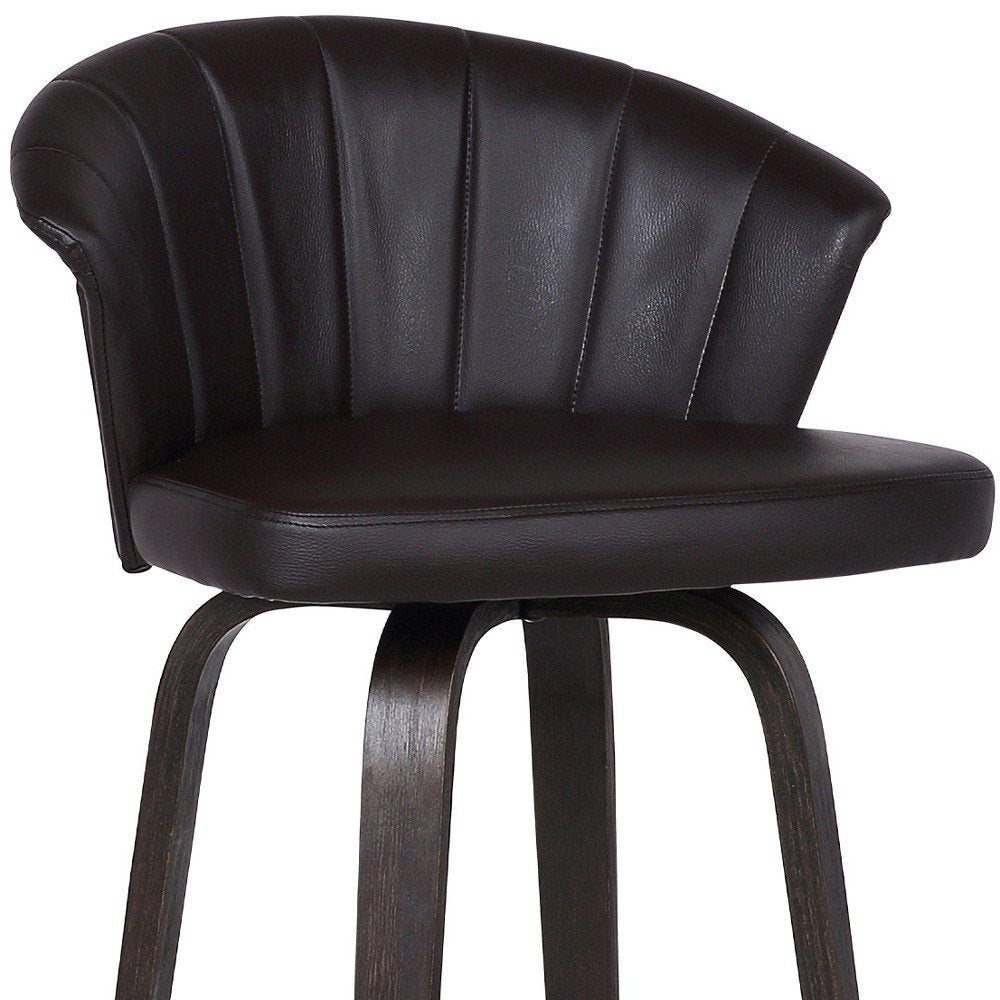 Add a mid-century flair to your space with this Dark Brown Faux Leather and Rustic Wood Back Swivel Bar Stool. A soft a comfy brown faux leather seat is highlighted by dark brown finish curved legs and framed with a rustic dark brown grainy finish across the back to give this chair a unique and special look. The inside of the back rest features rich looking channel stitching and the the chair has a swivel function for convenience and mobility. Enjoy optimal functionality and good looks with this great stool.39" x 22" x 20"