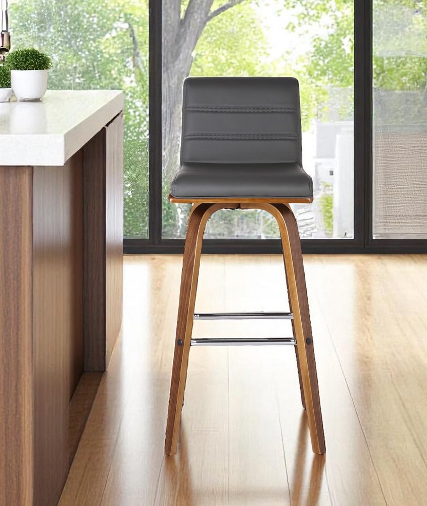 The perfect way to add some extra seating in your home, this 30-inch gray and brown faux leather and solid wood low back bar height swivel bar chair will elevate the look and vibe of your room. The brown coloration of the high quality solid wood base marries nicely with the gray faux leather seat. A low_back mixed with a rectangle shaped seat design makes this chair both comfortable and fashionable. Designed with a footrest for comfort and convenience. 39-inch h x 17-inch w x 20-inch d.
