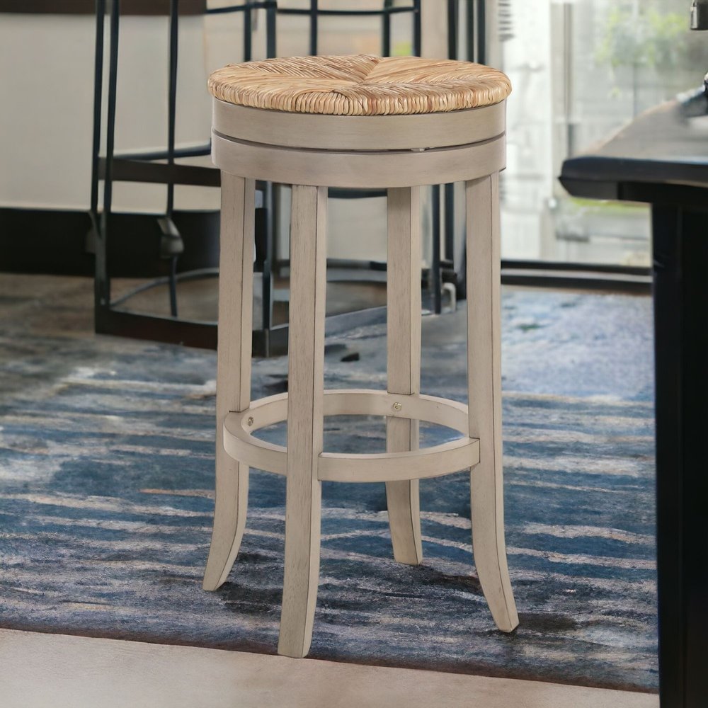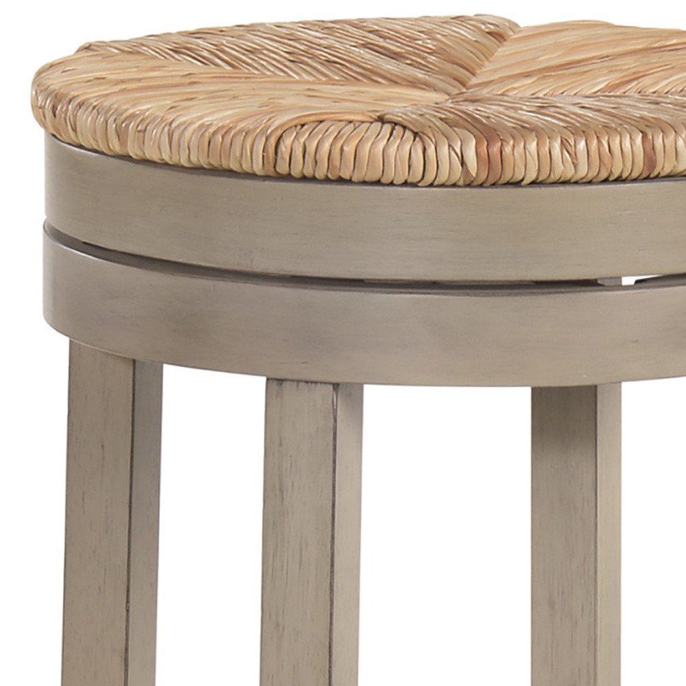 Bring a trendy bar vibe to your space, with this 30-inch natural and gray solid wood swivel backless bar height bar chair with footrest. The base of this stool is made from solid wood in a gray color that is a nice contrast to the natural rush seat. Designed to be good looking and practical, this backless bar chair features a round shaped seat. Designed with a footrest for comfort and convenience. 30-inch H x 19.5-inch W x 19.5-inch D
