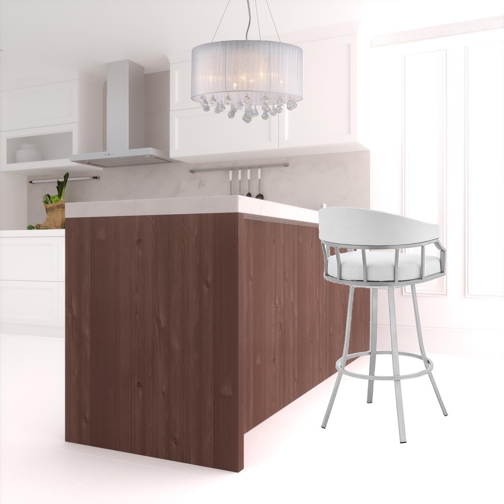 30" White And Silver Faux Leather And Iron Swivel Low Back Bar Height Bar Chair