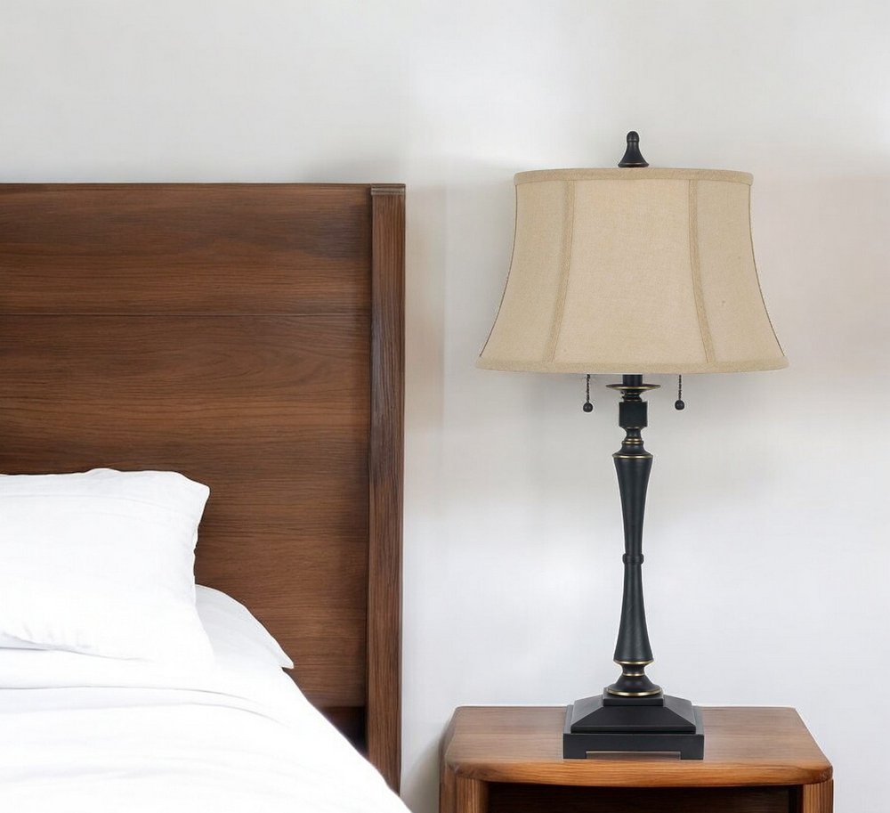 This 31-inch black metal two light candlestick table lamp with beige empire shade is the perfect combination of design and function. The lamp is made of sturdy metal and features a black color. The beige empire fabric shade is a great compliment to this lamp. This standard table lamp is designed to provide general lighting to the area. Use this lamp anywhere and elevate the look of the whole space. It is perfect for virtually any decor. 31-inch H x 16-inch W x 16-inch D