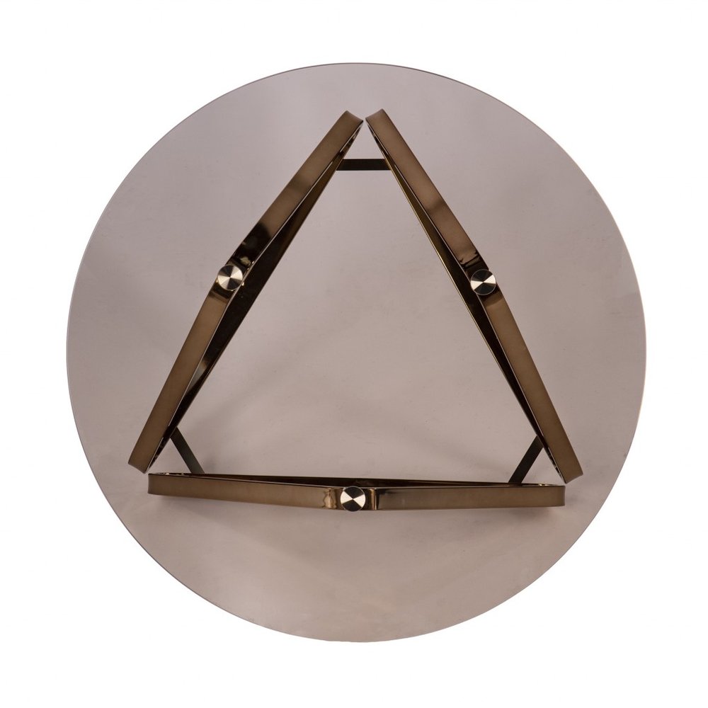 This stylish 31-inch smoky black and gold glass and metal round coffee table is not only practical, but good looking and built to last. The base of this table is consists of three triangular legs that create an open and airy geometric base finished in a champagne gold coloration. The gold geometric base of this modern table creates a good looking visual contrast to the smoky tinted black glass round tabletop. It has an attractive design that will definitely breathe some fresh air into your interior. 18.25-inch h x 31.25-inch w x 31.25-inch d.