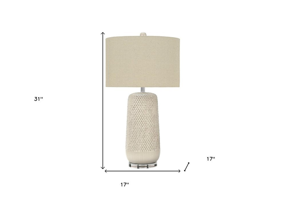 Embrace the good life with this hard working and stylish 31-inch cream ceramic geometric table lamp with beige drum shade. A gorgeous cream ceramic base brings just the right amount of pizzazz to this fabulous lamp. Includes a beige linen, drum shaped shade, making this a fashionable piece that will complement most any interior. This standard table lamp is designed to provide general lighting to the area. Use this lamp anywhere and elevate the look of the whole space. It is perfect for virtually any decor. 31-inch H x 17-inch W x 17-inch D