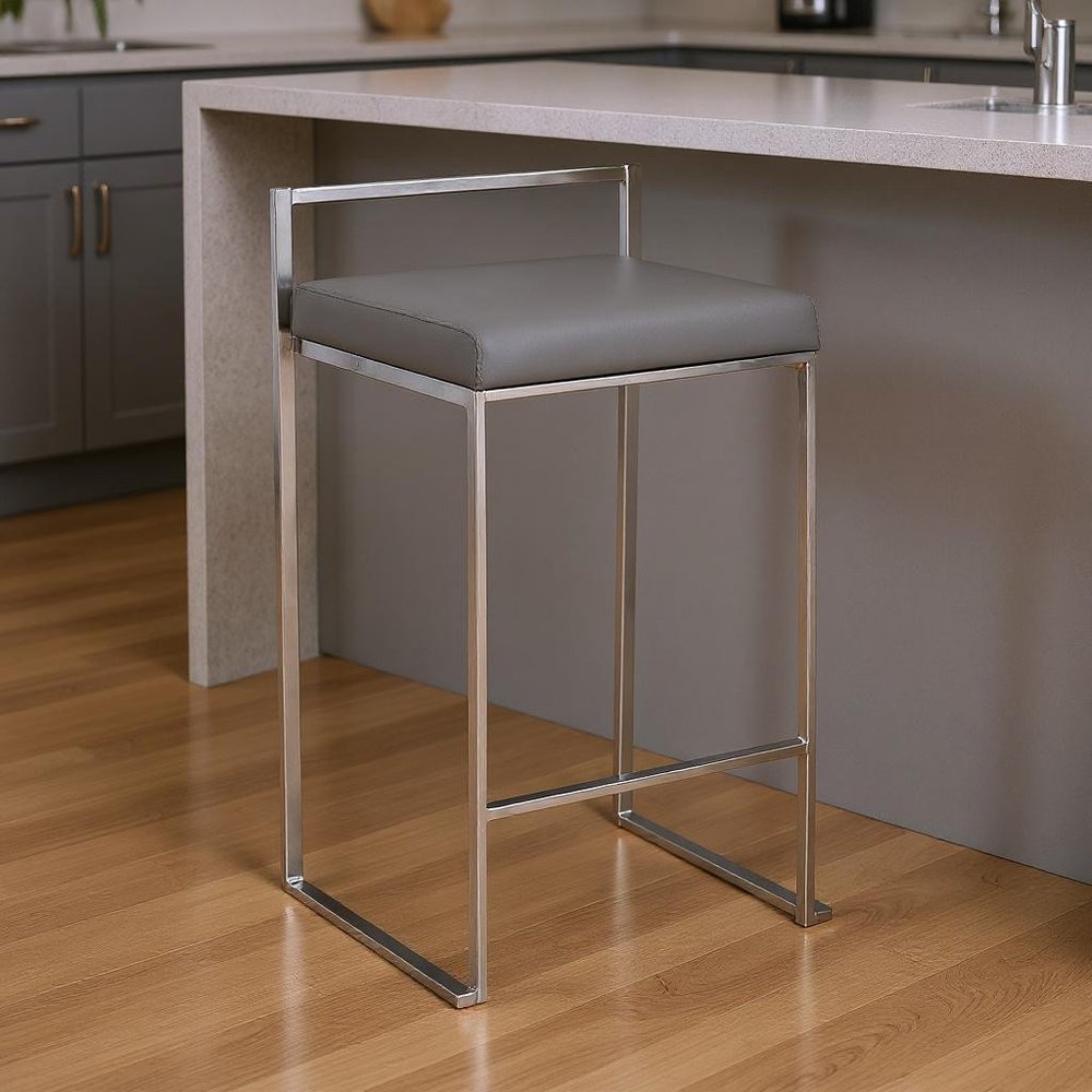 Comfortable enough to sit in for awhile, this 31" gray faux leather and solid wood backless bar height chair with footrest will transcend the look of your room. A chrome solid wood frame is finished off with a gray faux leather seat that is the epitome of quality construction and design. The square shape of the seat give this backless chair a fresh and fashionable look. Designed with a footrest for comfort and convenience. 31" H x 17.5" W x 15.625" D