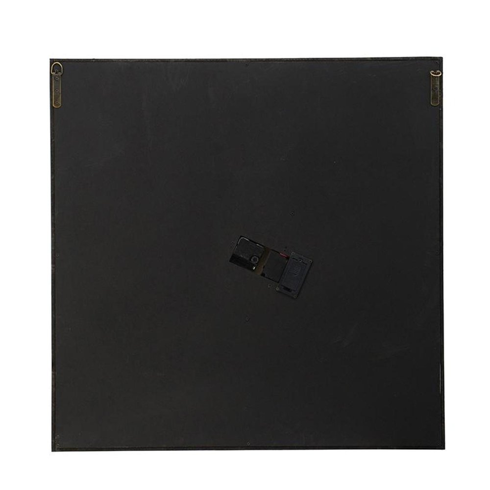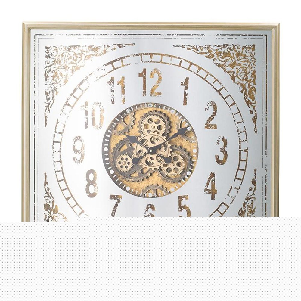 This 32-inch square gold and silver wood and mirror analog exposed gear wall clock includes three moving hands on the face that move smoothly to indicate the hour, minute and seconds. Features a practical, straight-edged square shape.. The clock face made from mirrored glass is reflective, beautiful and will add a modern touch. This clock was skillfully made with a purposefully distressed and vintage style finish. Stay on track with this elegant and efficient clock. With its unique design and practical purpose, this clock will add flair to your home while also acting as an essential tool. 31.5-inch H x 31.5-inch W x 3.1-inch D