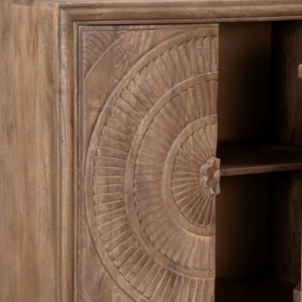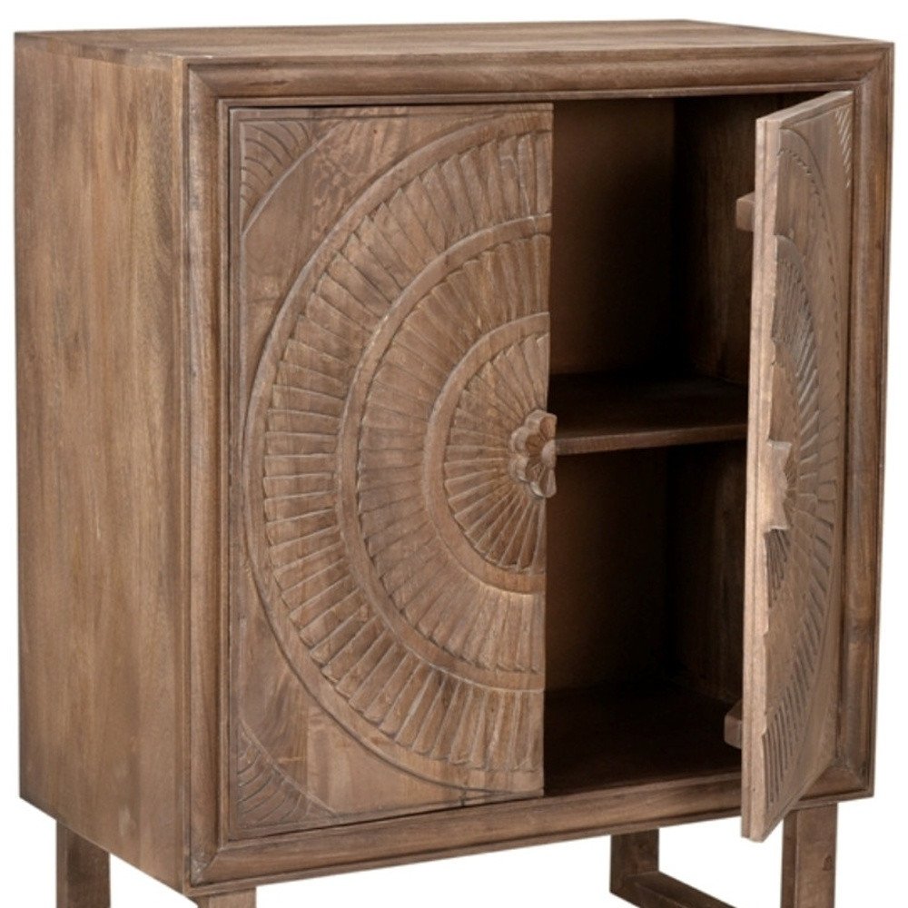 33" Distressed Brown Solid Wood Two Door Floral Carved Accent Cabinet