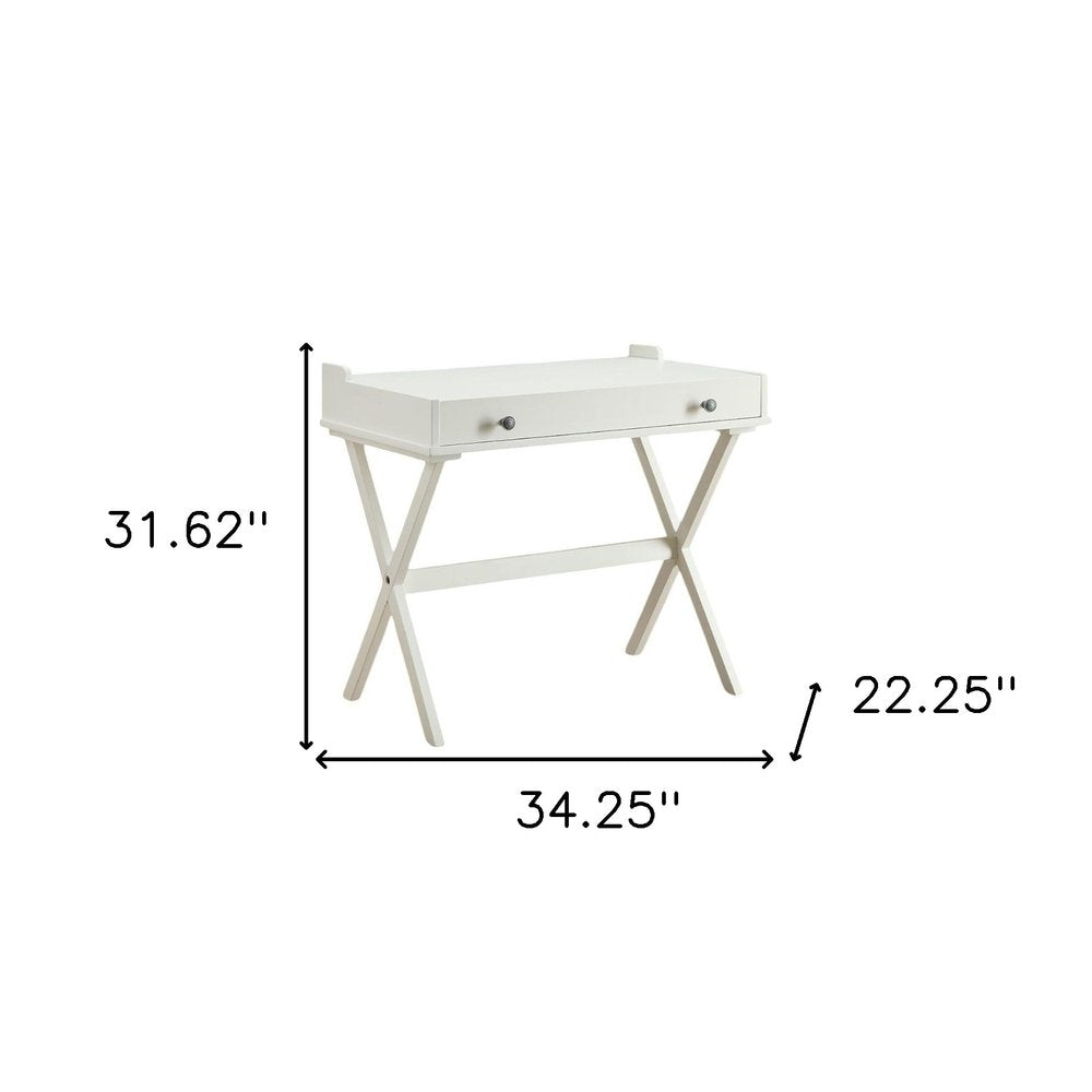 This 34-inch antiqued white wood writing desk will bring classic design and styling to your living room, home office or bedroom. Designed to easily fit into most spaces, this classically shaped rectangular desk will turn your room into a productive workspace. A single drawer gives this desk some hidden storage for your office essentials. Built to last, this sturdy desk is designed for comfort and efficiency for years to come. 31.62-inch h x 34.25-inch w x 22.25-inch d.